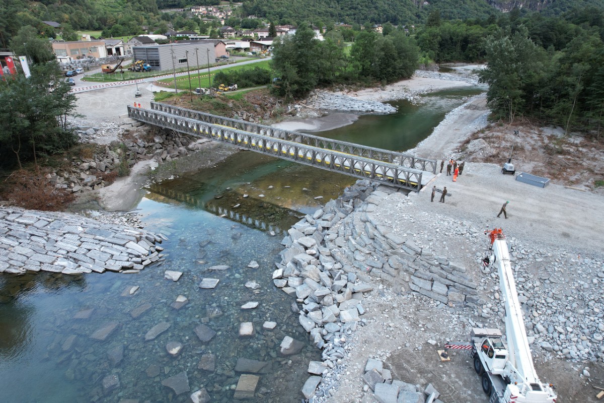 Im Maggiatal hat die Schweizer Armee den Bau einer 61 Meter langen Unterstützungsbrücke abgeschlossen. Sie dient als Ersatz für die Visletto-Brücke, die beim Unwetter Ende Juni zerstört wurde. Das obere und das untere Maggiatal sind somit wieder ohne die Einschränkungen des Hilfssteges verbunden. Die Armee setzt ihre Arbeiten im Val Bavona und Val Lavizzara fort.