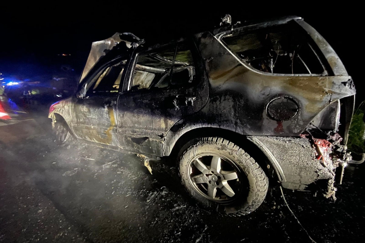 Das Zugfahrzeug brannte vollständig aus und wurde durch den Brand total beschädigt. (Bildquelle: Kantonspolizei Graubünden)