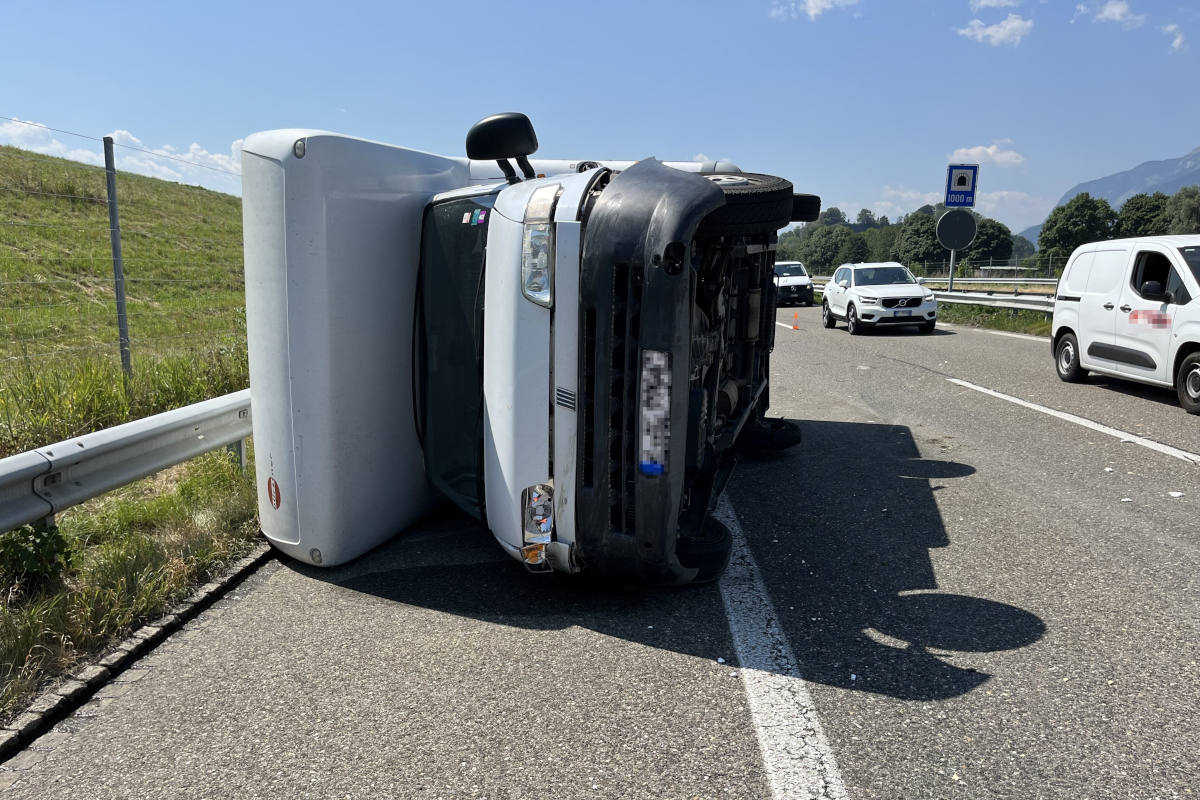 Wohnmobil kippt nach geplatztem Reifen um auf der A13 bei Montlingen (Bildquelle: Kapo SG)