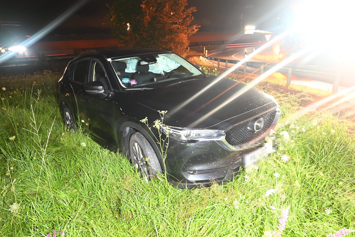 Dabei geriet das Auto in der Rechtskurve der Ausfahrt von der Fahrbahn ab, prallte gegen einen Leitpfosten und kam anschliessend im Wiesland zum Stillstand.