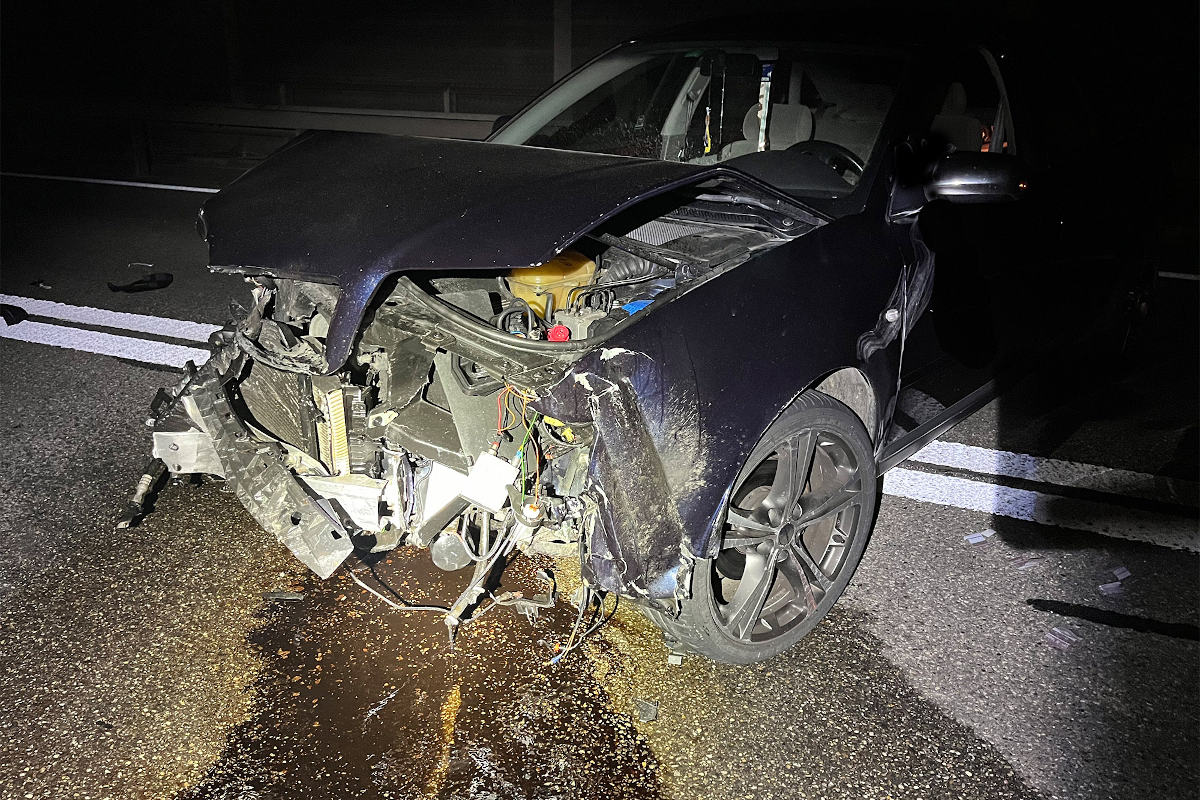 Der blaue Audi des Lenkers verlor viel Betriebsflüssigkeit. (Bildquelle: Kantonspolizei Basel-Landschaft)