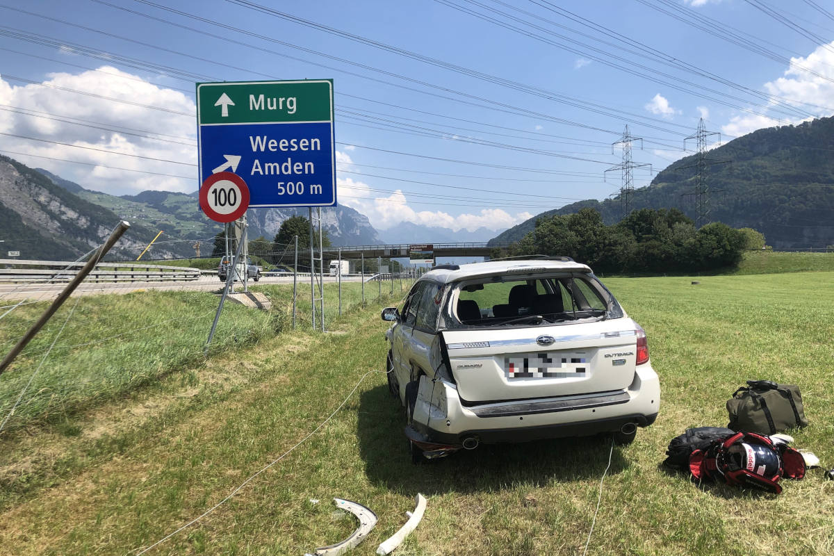 Kurz vor 14 Uhr war ein 20-jähriger Lenker mit seinem Personenwagen in Fahrtrichtung Chur unterwegs. Als er kurz vor der Ausfahrt Weesen einen Militärlastwagen überholte, bemerkte er zu spät, dass sich der Verkehrsfluss verlangsamte und die vorausfahrenden Fahrzeuge abbremsen mussten. Um eine Auffahrkollision zu verhindern, wich der 20-Jährige nach rechts aus und geriet dabei ins Schleudern. In der Folge prallte er zunächst in die Mittelleitplanke, kam dann rechts von der Fahrbahn ab und kollidierte mit dem Wildschutzzaun, ehe er schliesslich im Wiesland zum Stillstand kam. Beim Unfall wurde niemand verletzt; am Auto entstand Totalschaden.