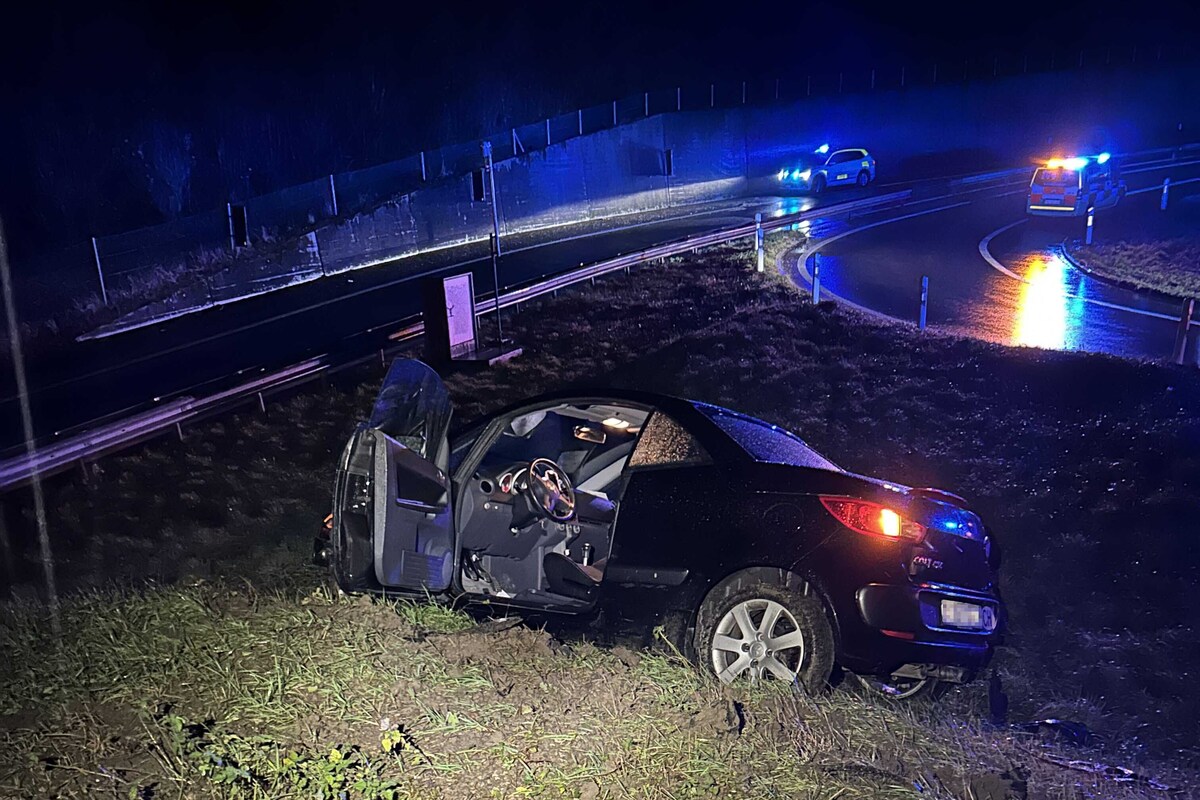 Im Ausfahrtsbereich ist ein Autofahrer mit seinem Fahrzeug neben die Fahrbahn auf das Wiesland geraten. Dort kam das Fahrzeug in Schräglage zum Stillstand. Verletzt wurde niemand. Das Fahrzeug wurde erheblich beschädigt.