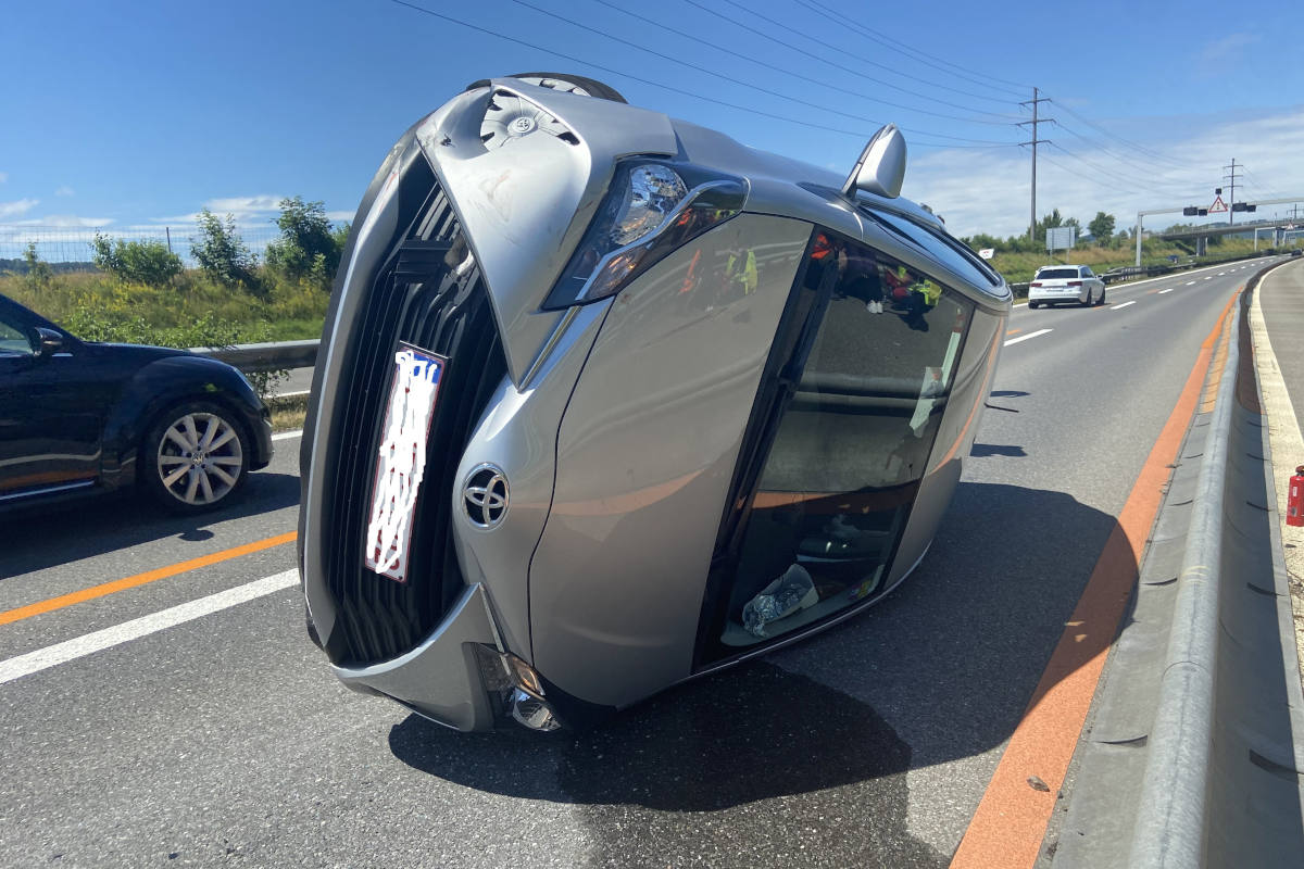 54-jährigen Automobilistin legt ihr Fahrzeug auf der A3 bei Scherz auf die Seite (Bildquelle: Kantonspolizei Aargau)