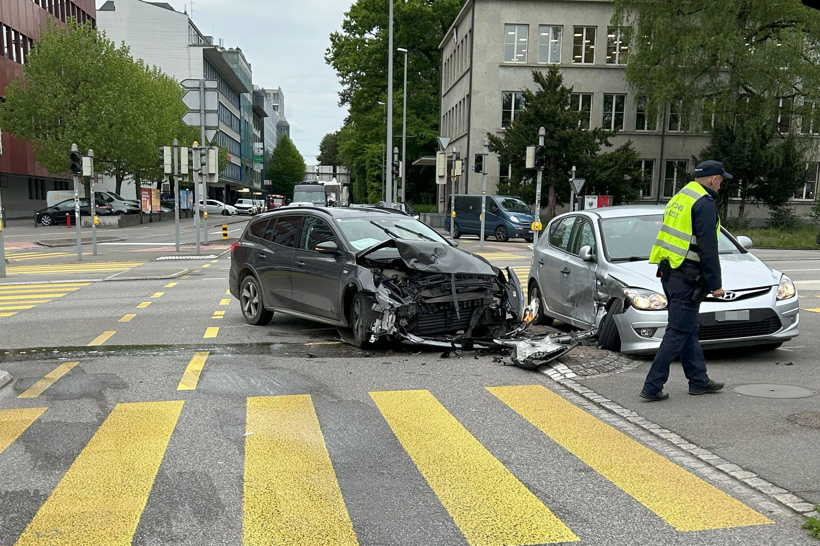 Mitten auf der stark befahrenen Kreuzung stiess der Ford dann heftig mit einem anderen Wagen zusammen.