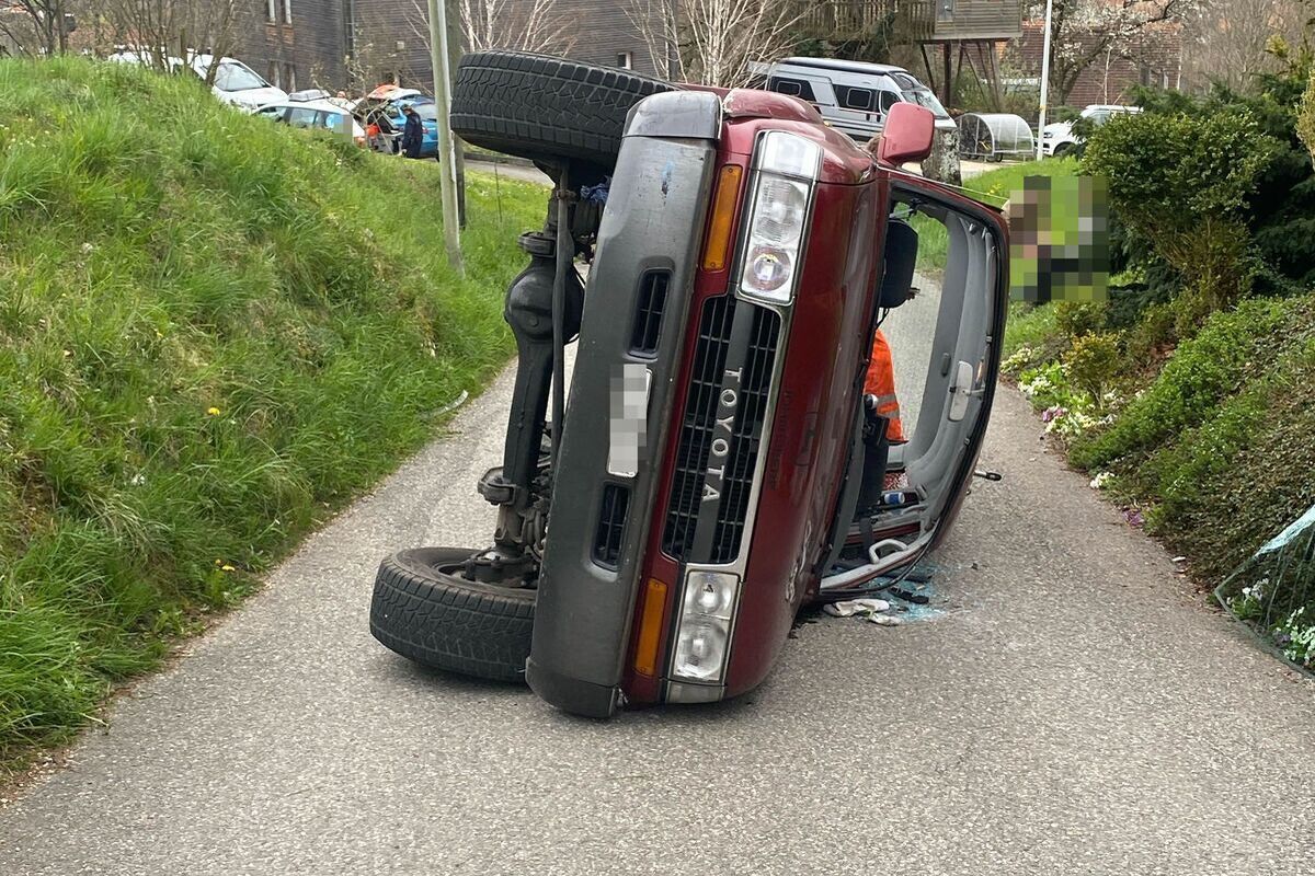 Schliesslich kippte das Auto und kam auf der Seite liegend zum Stillstand. Alle vier Insassen konnten das Fahrzeug selbstständig verlassen. Der Fahrzeuglenker zog sich leichte Verletzungen zu, die weiteren Mitfahrenden blieben nach ersten Erkenntnissen unverletzt.