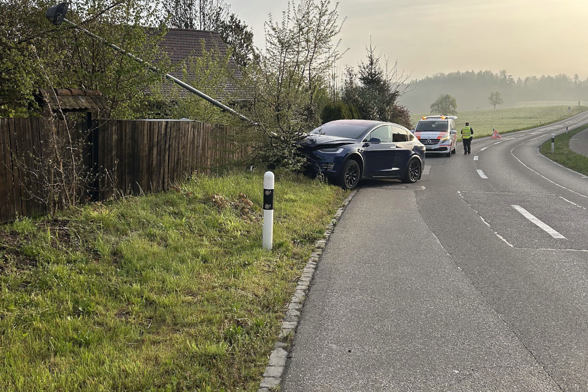 Der Selbstunfall ereignete sich am Samstag, 19. April 2025, kurz vor sieben Uhr auf der Abtwilerstrasse in Aettenschwil. Von Sins kommend verlor der Lenker eines Tesla eingangs Dorf die Kontrolle und kam rechts von der Fahrbahn ab.