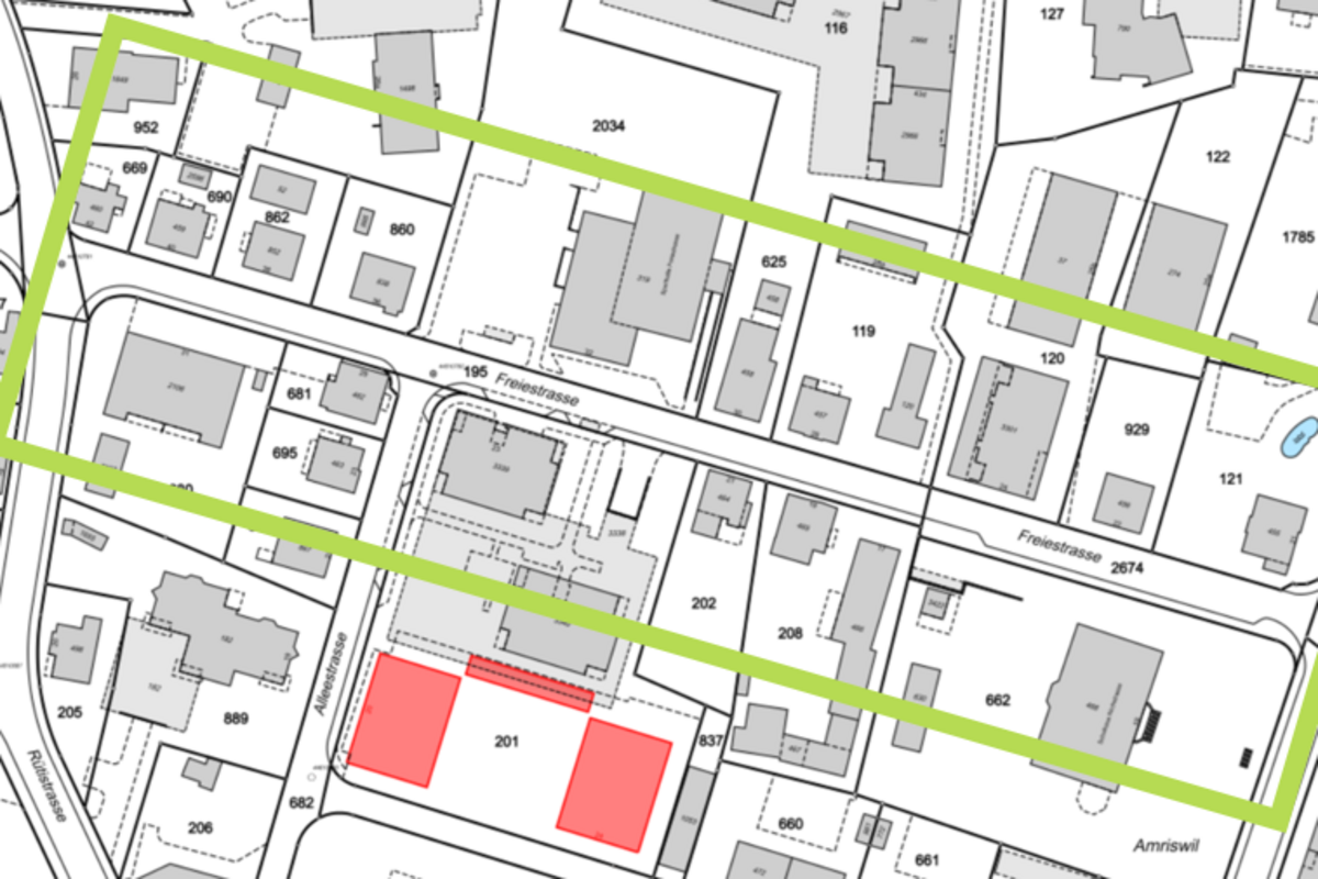 In dem grün markierten Abschnitt wird die Freiestrasse ab kommendem Montag saniert (Bildquelle: Stadt Amriswil)