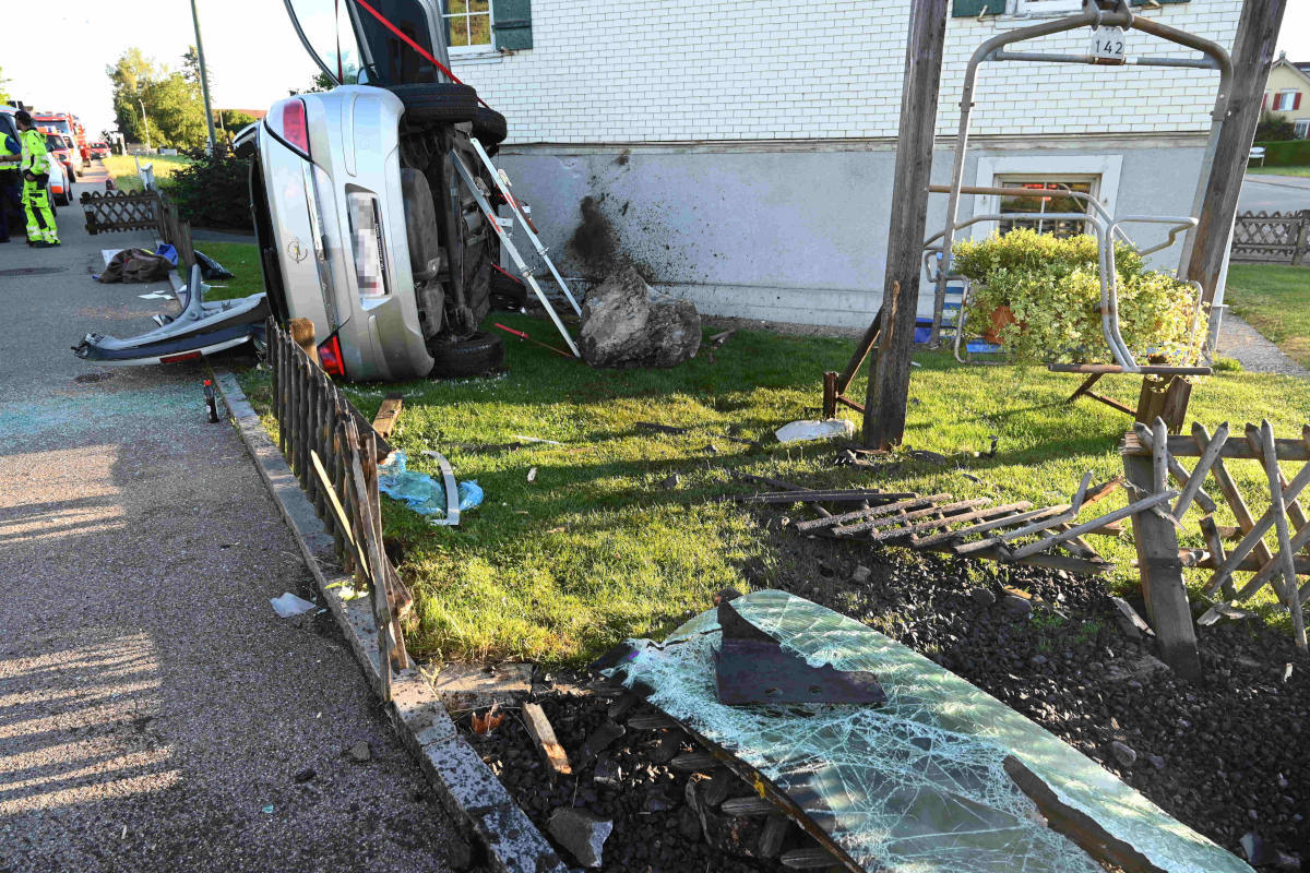 Der 35-jährige Autofahrer und sein 44-jähriger Mitfahrer fuhren von Gossau kommend in Richtung Andwil. Höhe der Einmündung Augartenstrasse verlor der 35-Jährige aus bislang unbekannten Gründen die Kontrolle über sein Auto. Dabei fuhr er gegen den Randstein und durchbrach im Anschluss einen dortigen Holzzaun. Danach kollidierte das Auto gegen einen Stein und kippte dadurch auf die linke Seite. Schlussendlich prallte das Auto gegen eine Hausmauer und kam auf der Seite liegend zum Stillstand.