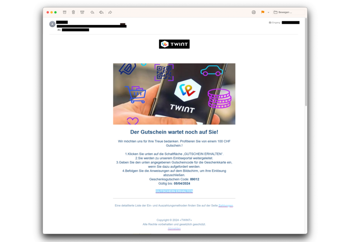 Betrüger versprechen in E-Mails, die angeblich von TWINT stammen, einen Treuegutschein im Wert von 100 Franken. Mit den erhaltenen Informationen versuchen die Kriminellen den TWINT Account zu übernehmen.