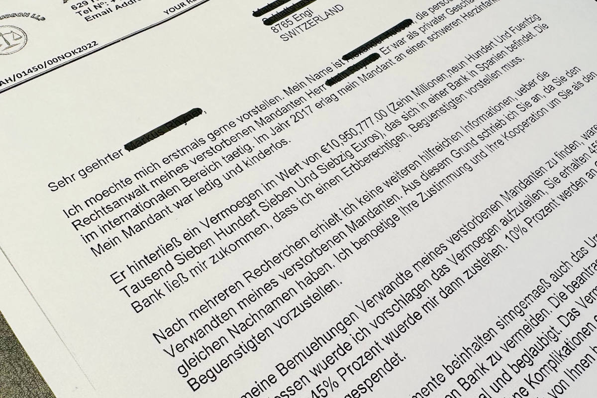 gestellt. Diese Briefe von angeblichen Rechtsvertretern sind persönlich adressiert und mit Stempeln und Unterschriften versehen. Sie wirken auf den ersten Blick recht vertrauenswürdig und wecken bei einzelnen Adressaten die Hoffnung, an das grosse Erbe zu kommen.