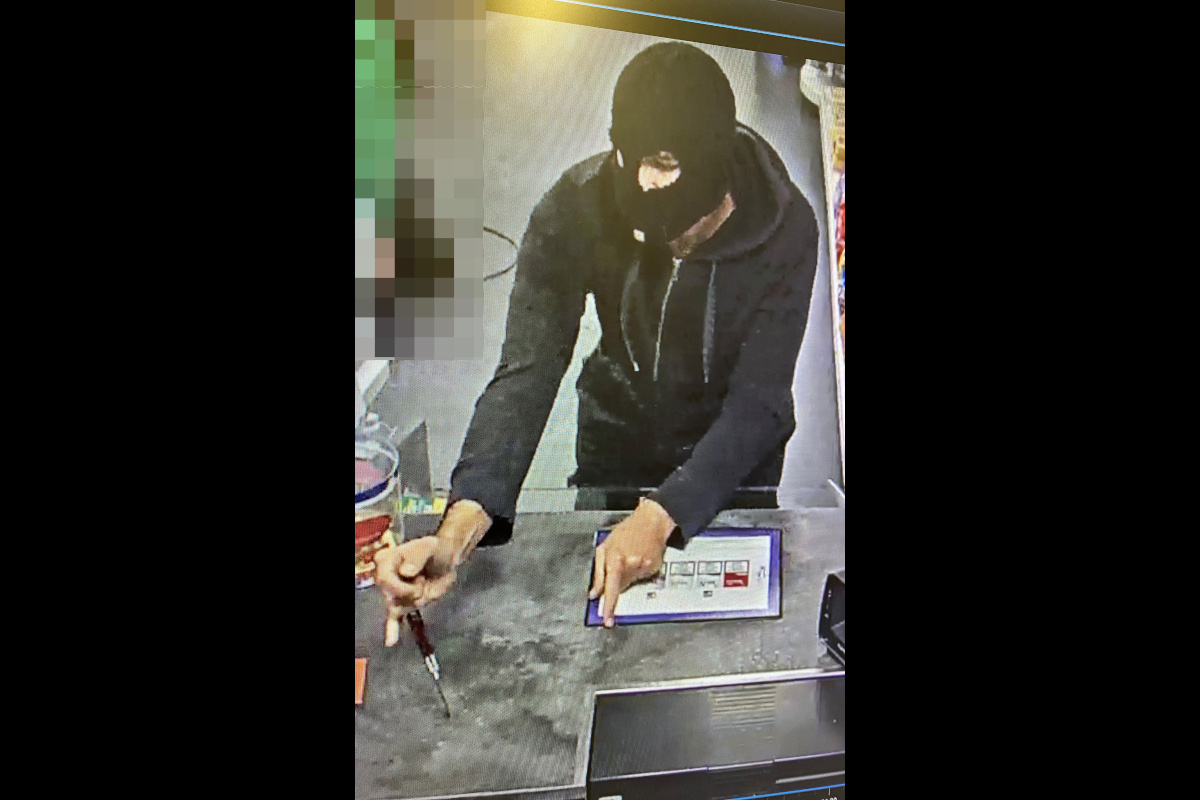 Der Täter war mit einer schwarzen Sturmhaube vermummt und trug dunkle Kleidung sowie braune Schuhe. Er hat auffällige Tätowierungen am Hals und am Handrücken. Das Messer hatte einen braunen Griff.