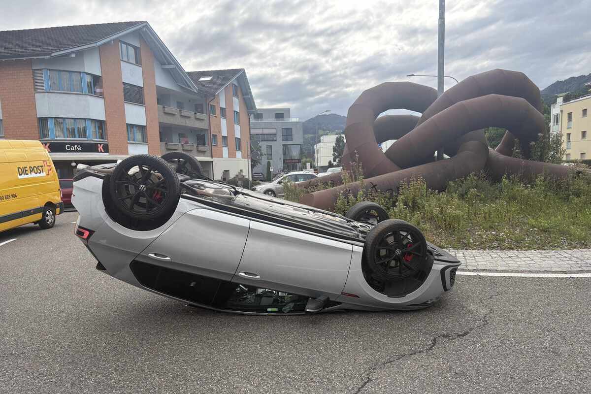Ein 24-jähriger Mann hat in Au fahrunfähig einen Selbstunfall verursacht. Sein Auto überschlug sich im Kreisel und blieb auf dem Dach liegen.