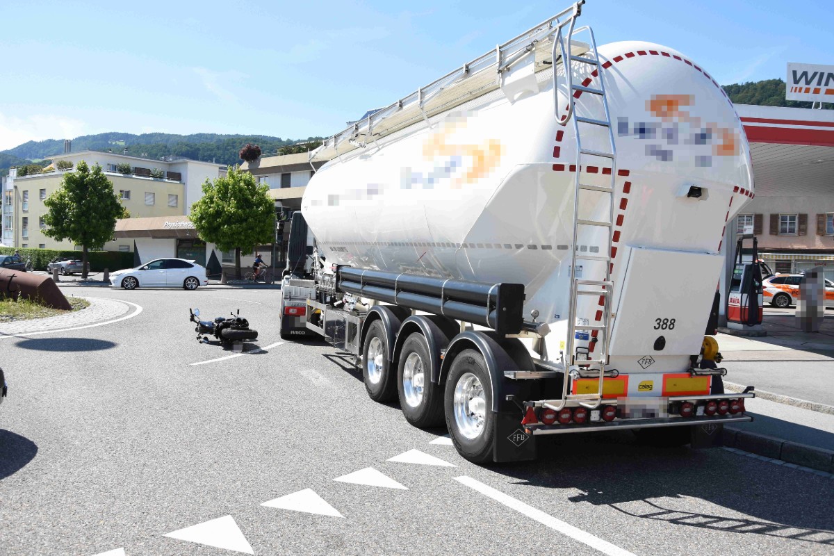 Am Samstag (10.07.2021), um 15:10 Uhr, ist es auf der Zollstrasse zu einem Unfall zwischen einem Sattelschlepper und einem Töff gekommen. Der Töfffahrer wurde dabei leicht verletzt.