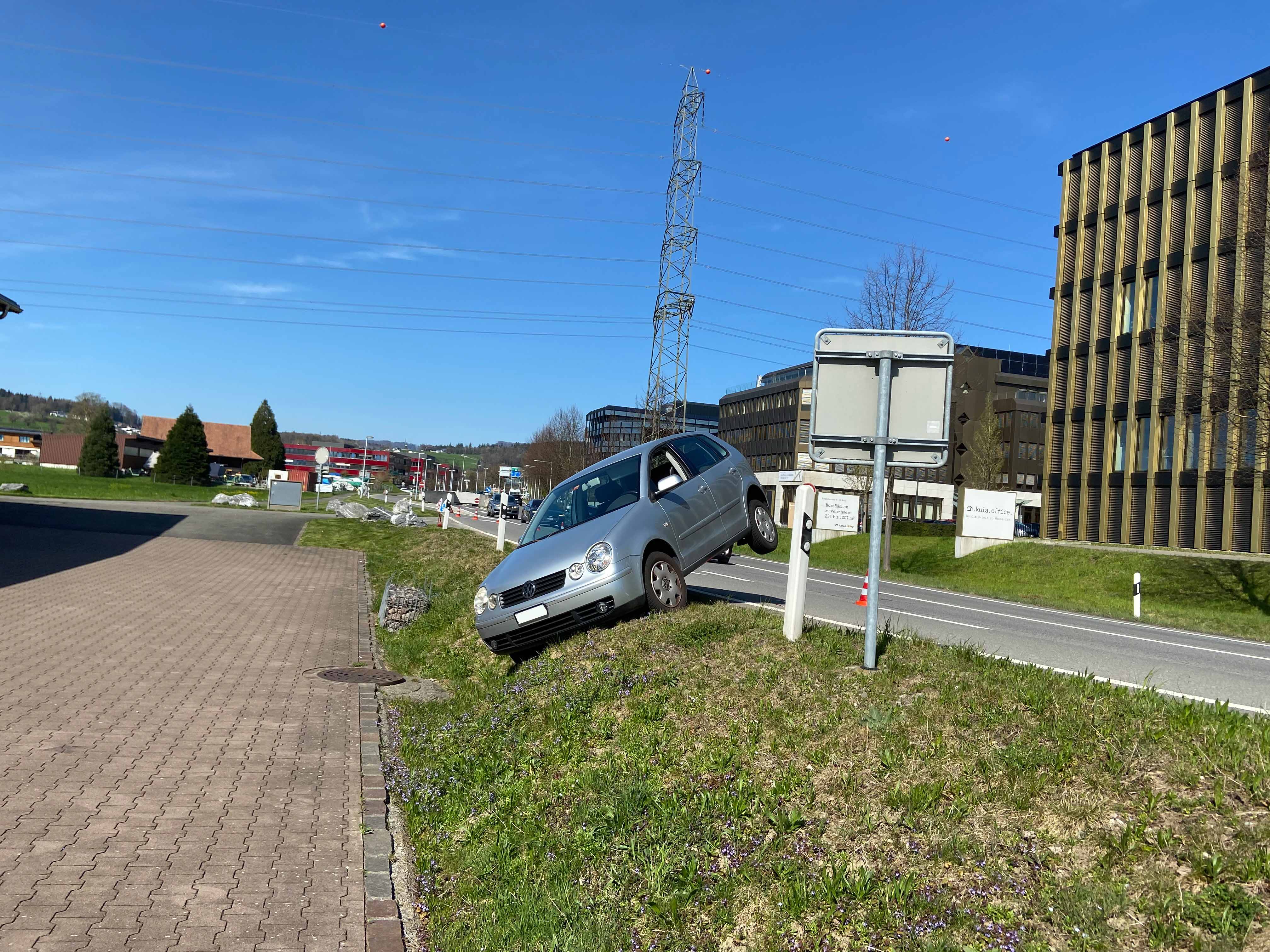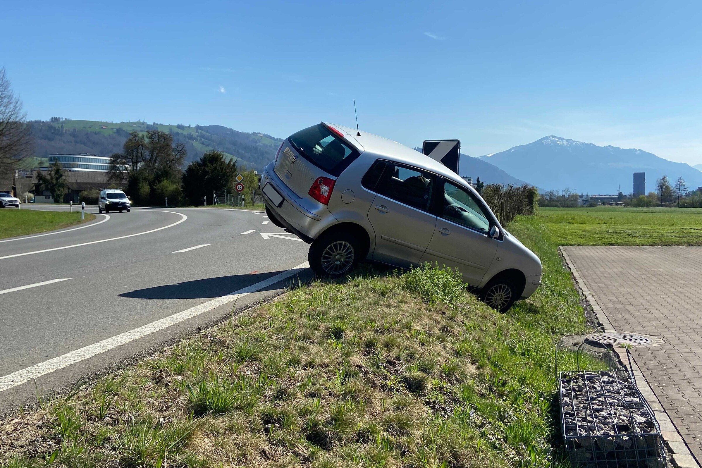 In Baar blieb ein 89-jähriger Autofahrer bei einem Selbstunfall mit seinem PW auf einem Wiesenbord hängen.