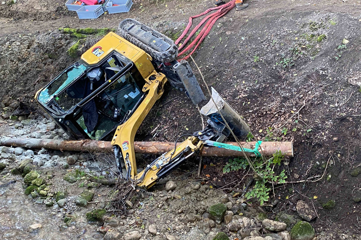 Der Unfall ereignete sich am Montagnachmittag (15. September 2025), kurz nach 16:00 Uhr, im Bereich Dorfmatt in Allenwinden (Gemeinde Baar). Bei Sanierungsarbeiten auf einem Waldweg ist ein Bagger ins Rutschen gekommen, zur Seite gekippt und im Bachbett gelandet.