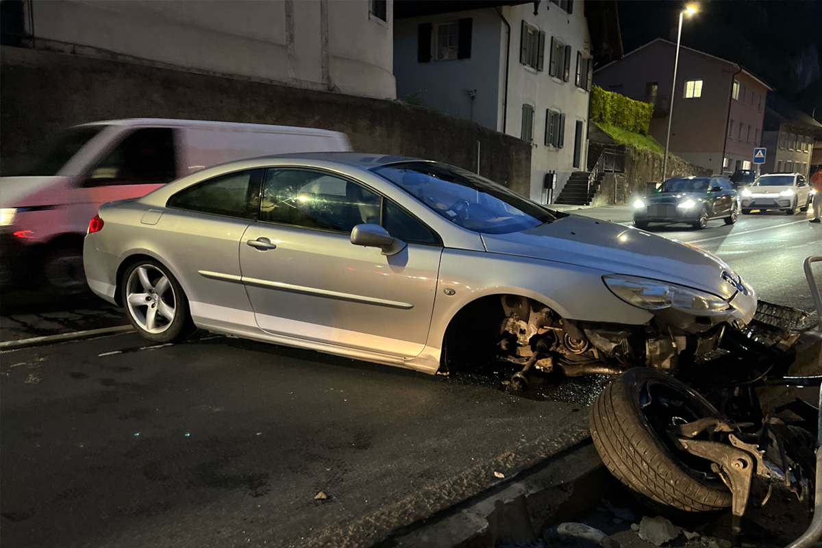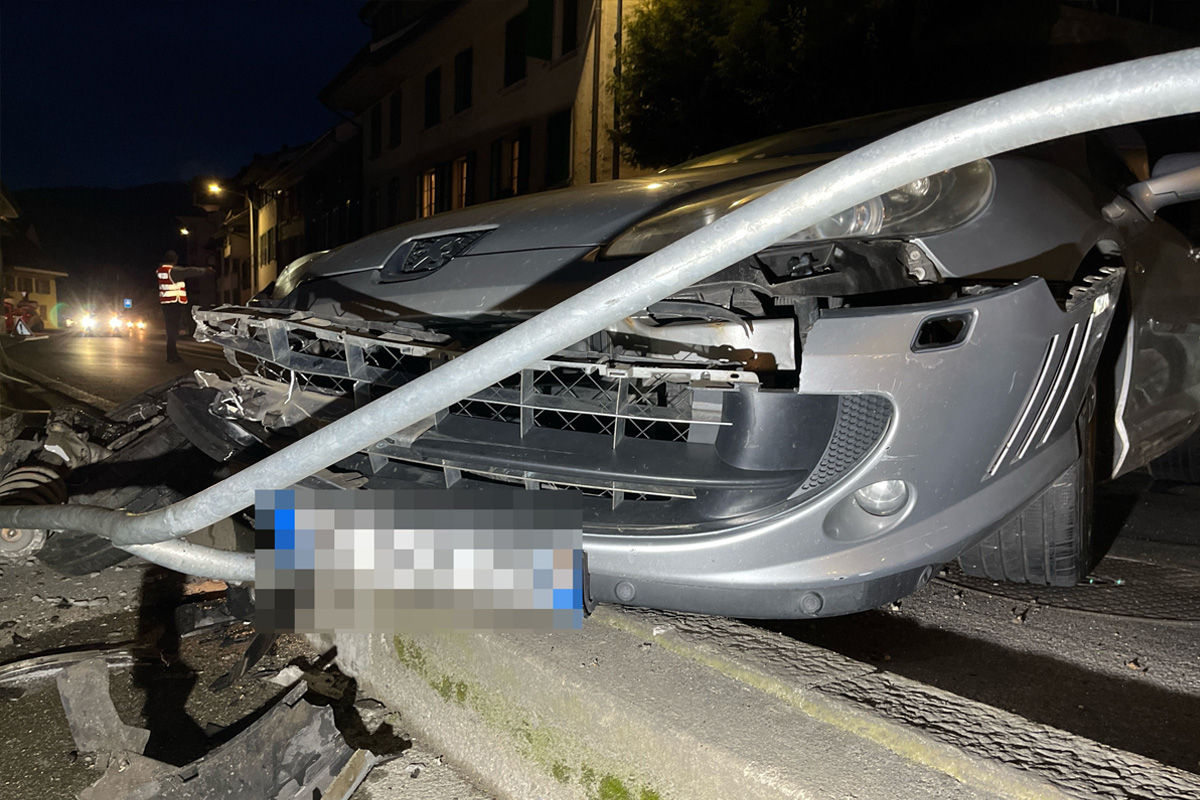 Im Bereich der Liegenschaft Nr. 28 verlor er die Kontrolle über das Auto, kam rechts von der Strasse ab und prallte in ein Schutzgeländer. Schliesslich kam das stark beschädigte Auto quer zur Strasse zum Stillstand.