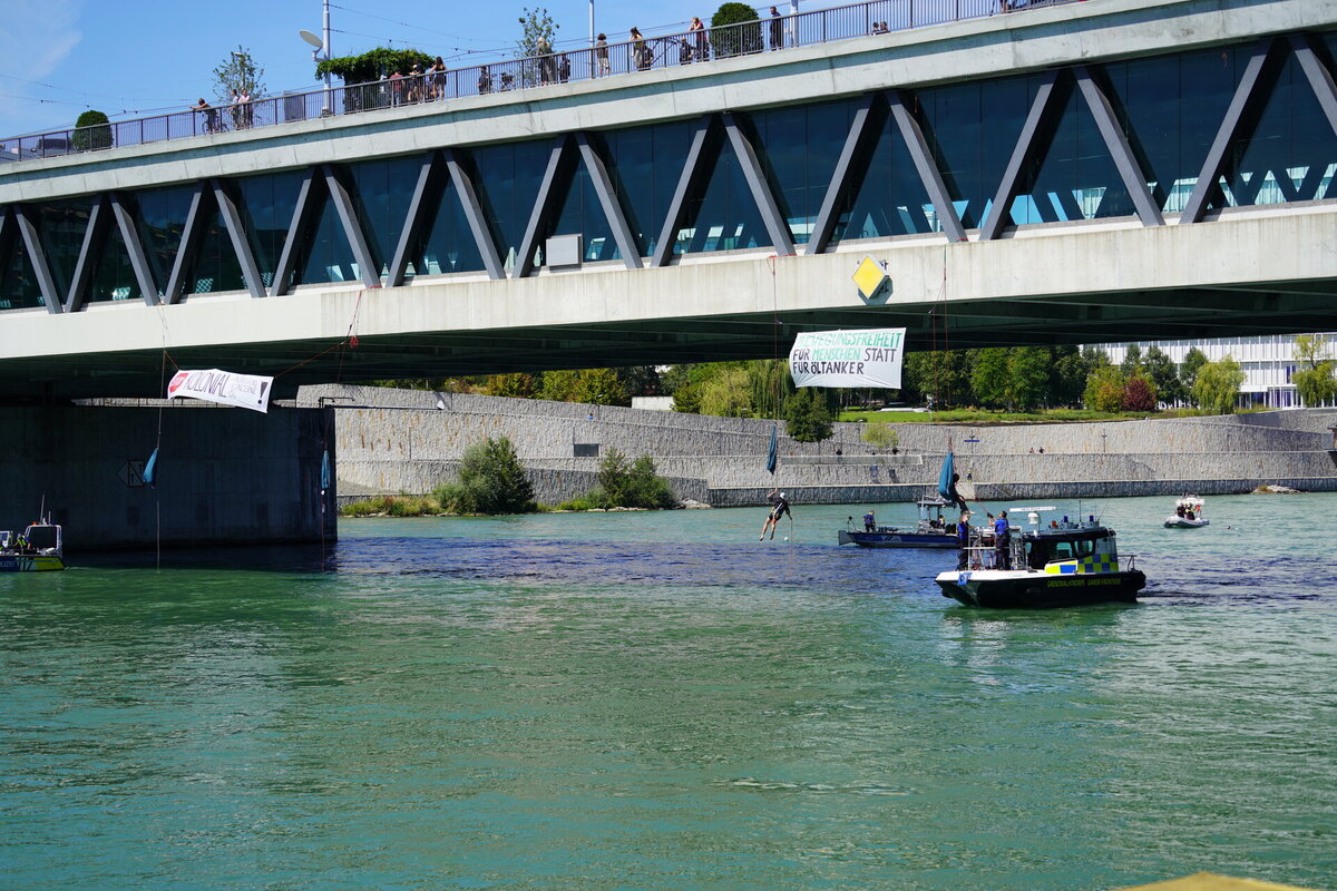 Freitag, 11. August 2023 kurz vor 06.00 Uhr seilten sich fünf Personen mit Kletterausrüstung von der Dreirosenbrücke über die Schifffahrtsrinne des Rheins ab und installierten Transparente. Durch die Schweizerischen Rheinhäfen wurde in Absprache mit der Kantonspolizei Basel-Stadt die Schifffahrt aus Sicherheitsgründen eingestellt.