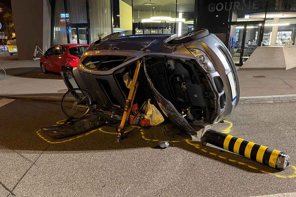 Auf der Kreuzung mit der Nauenstrasse kollidierte sein Auto mit einem Personenwagen, das aus Richtung Bahnhof SBB kam. Durch die Wucht des Aufpralls überschlug sich sein Fahrzeug und riss auf der Kreuzung einen Verkehrsteiler mit. Auf der Gegenfahrbahn wurde die Velofahrerin erfasst, die in Richtung Jacob Burckhardt-Strasse unterwegs war. Bevor das Fahrzeug auf dem Dach liegend zum Stillstand kam, touchierte es ein weiteres Auto, das sich auf der Fahrspur in Richtung Grosspeterstrasse befand.