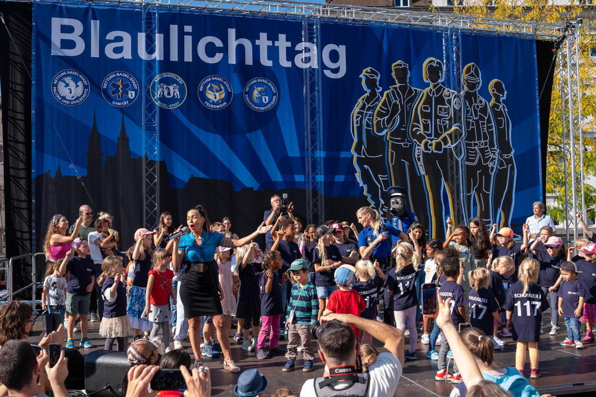 Die Live-Premiere des Blaulichtsongs „Mir sin für Di do“ fand am Blaulichttag statt. (Bildquelle: Kantonspolizei Basel-Stadt)