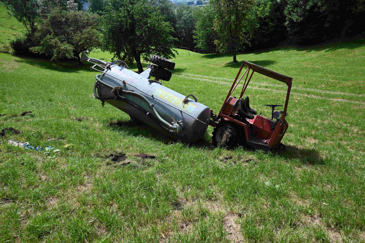 Der 28-Jährige fuhr mit seinem landwirtschaftlichen Fahrzeug ins geneigte Gelände. Da das beladene Druckfass voll war und er zu weit in den Steilhang hinauffuhr, verlagerte sich der Schwerpunkt des Fahrzeuges. Dabei kippte es zur Seite und überschlug sich einmal. Dadurch wurde der 28-Jährige schwer verletzt. Er wurde durch die Rega ins Spital geflogen. Es entstand Sachschaden von rund 2'500 Franken.