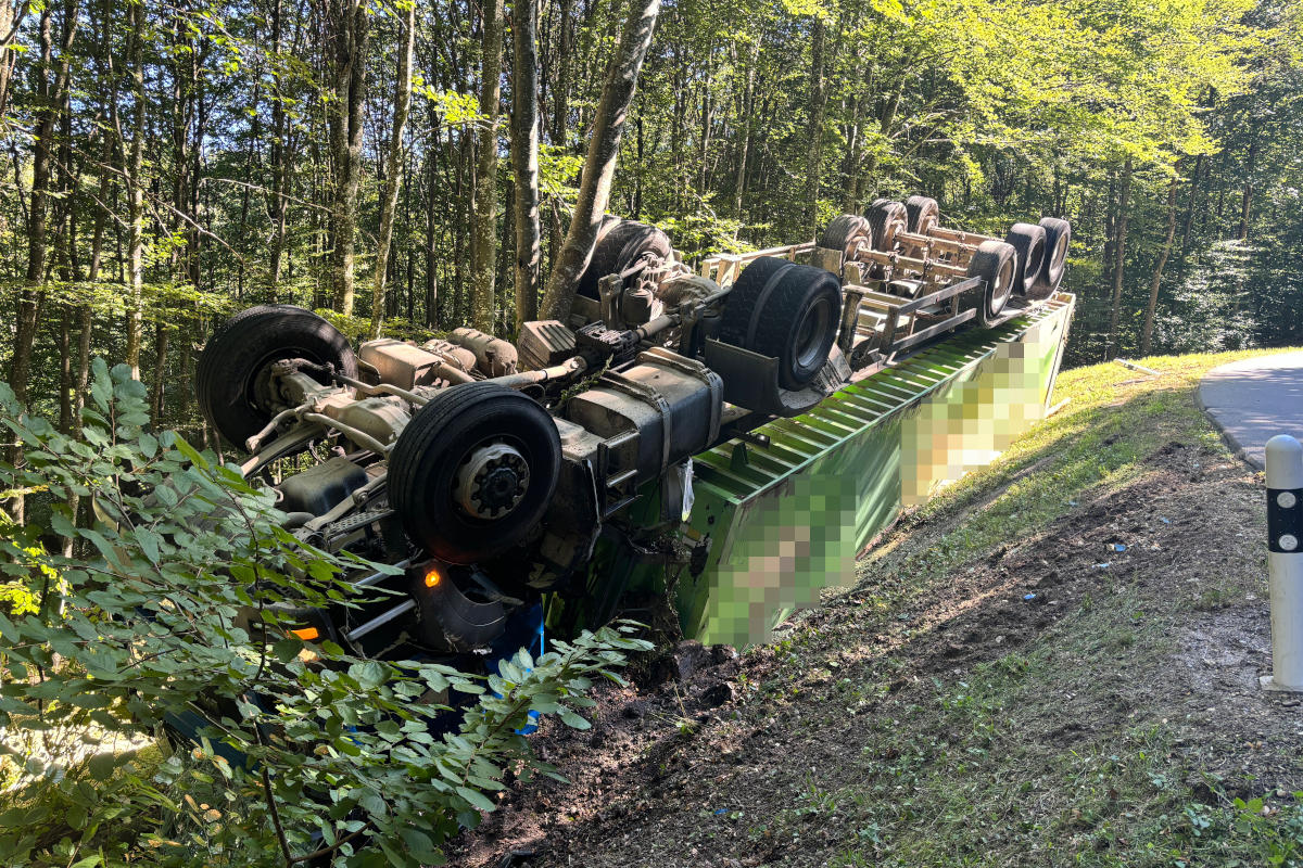 Ein 20-jähriger Lastwagenfahrer war kurz vor Mittag auf der Bergstrasse von Raperswilen in Richtung Berlingen unterwegs. In einer Linkskurve geriet das mit Häckselmais beladene Fahrzeug von der Fahrbahn, überschlug sich und kam im abfallenden Gelände zum Stillstand. Der Fahrer wurde leicht bis mittelschwer verletzt und musste durch den Rettungsdienst ins Spital gebracht werden. Am Fahrzeug entstand Sachschaden von mehreren zehntausend Franken.