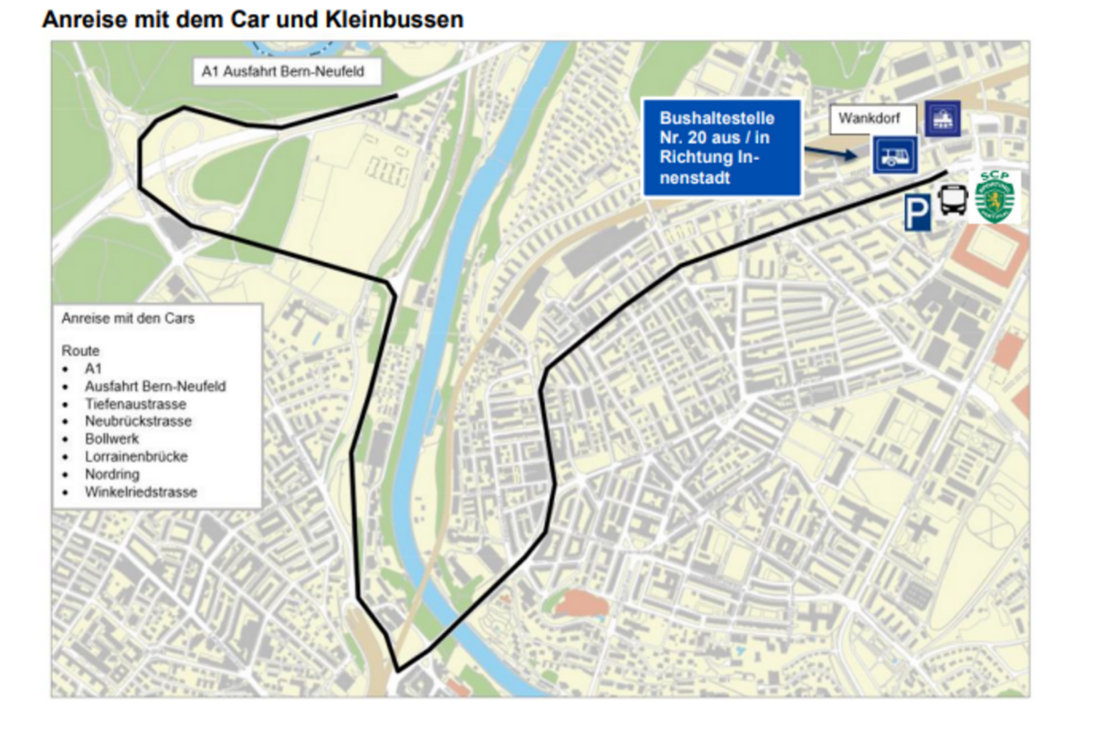 Im Grossraum Wankdorf und in der Innenstadt ist mit Verkehrseinschränkungen und einem erhöhten Personenaufkommen zu rechnen. Die Winkelriedstrasse wird vor und nach dem Fussballspiel jeweils in beiden Richtungen gesperrt. Rund um das Stadion kann es vor und/oder nach dem Spiel situativ und kurzfristig zu weiteren Strassensperrungen kommen. Aufgrund der begrenzten Anzahl Parkplätze in der Umgebung des Stadions wird Matchbesucherinnen und -besuchern empfohlen, frühzeitig mit öffentlichen Verkehrsmitteln anzureisen.