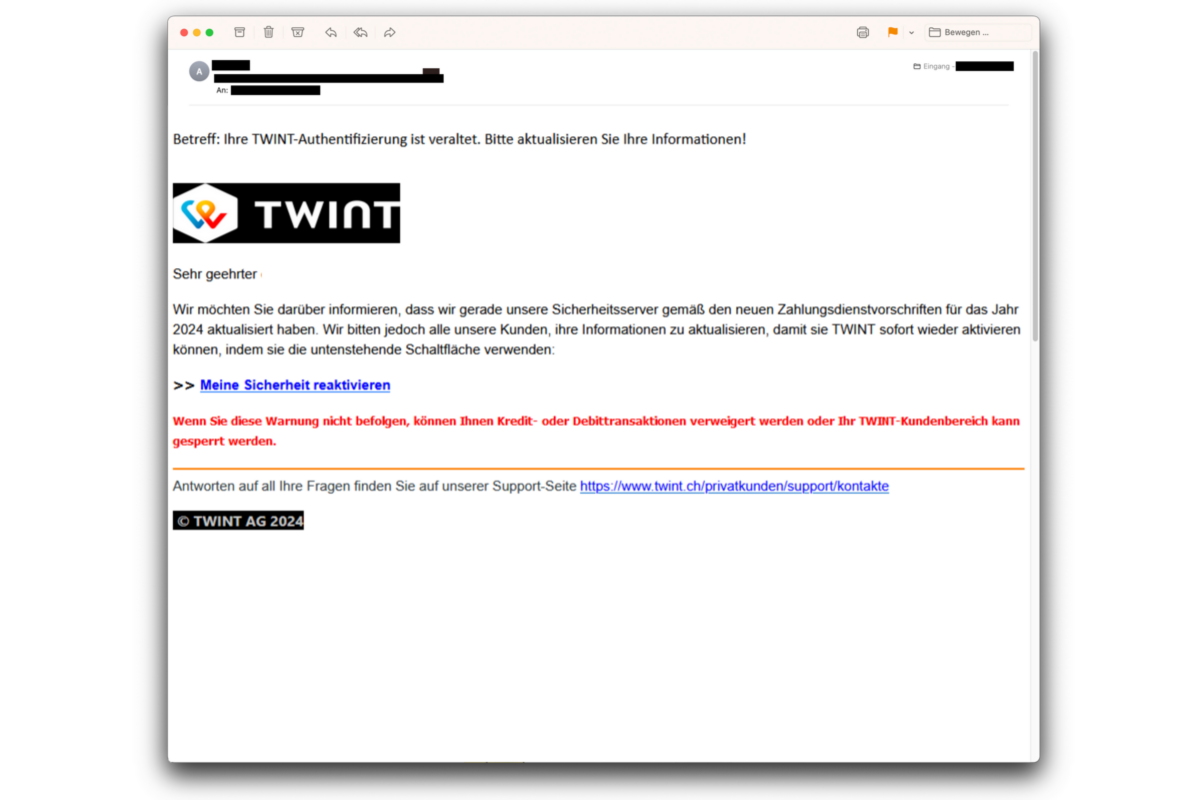 Damit angeblich der Zugang zum TWINT-Konto nicht verloren wird, sollen die Kontoinformationen aktualisiert werden. Cyberkriminelle verschicken dafür E-Mails, welche angeblich von TWINT stammen, um potenzielle Opfer in die Phishing-Falle zu locken.