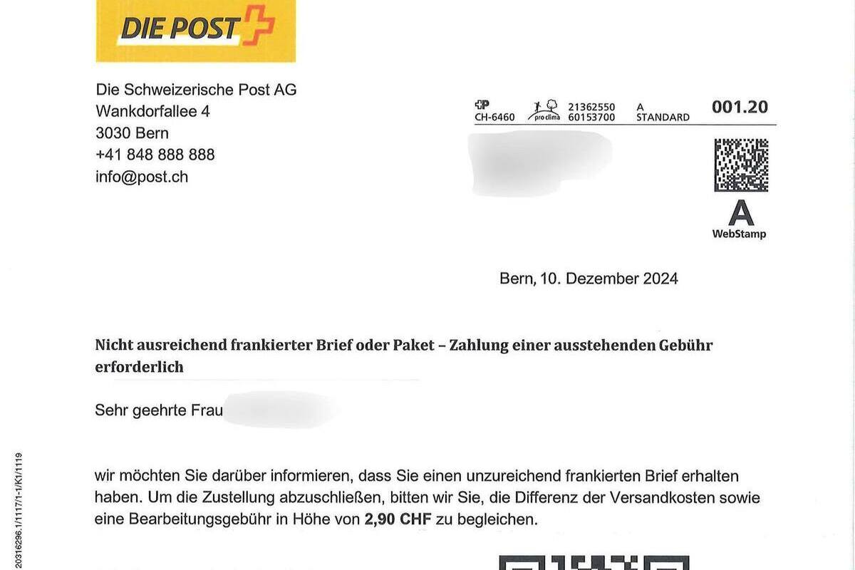 Aktuell kursieren gefälschte Briefe, die angeblich von der Schweizerischen Post stammen. Diese Briefe enthalten einen QR-Code und fordern dazu auf eine Zahlung zu leisten. Achtung: Diese Briefe sind Fälschungen!