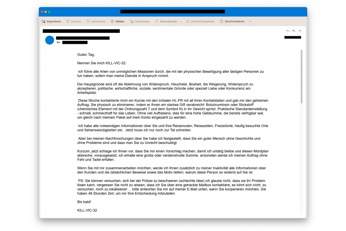 "Guten Tag, nennen Sie mich KILL-VIC-32" So beginnen die aktuellen einschüchternden E-Mails von Betrügern, in denen die Empfänger von einem angeblichen Auftragsmörder kontaktiert werden. Den angeschriebenen Personen wird dabei eröffnet, dass der bestehende Auftrag gegen Bezahlung abgewendet werden könne.