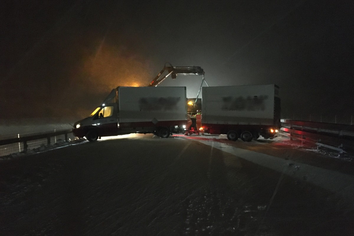 Ein nachfolgender 26-jähriger Lenker eines Personenwagens bemerkte in dichtem Schneetreiben das Unfallfahrzeug zu spät und konnte eine Kollision mit der Fahrzeugkombination nicht mehr verhindern. Es entstand an beiden Fahrzeugen und den Leitplanken erheblicher Sachschaden. Beim Unfall wurde niemand verletzt.