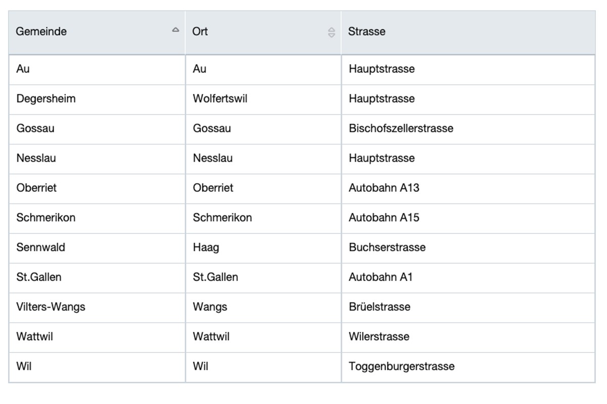 Die kantonspolizei st.gallen veröffentlicht als Massnahme zur Erhöhung der Verkehrssicherheit die Standorte der semistationären Messanlagen im Kanton St.Gallen (ohne Stadt St.Gallen). Die Aktualität der Liste wird nicht garantiert. Es kann sein, dass einzelne Standorte zwischen den Publikationsdaten versetzt werden.