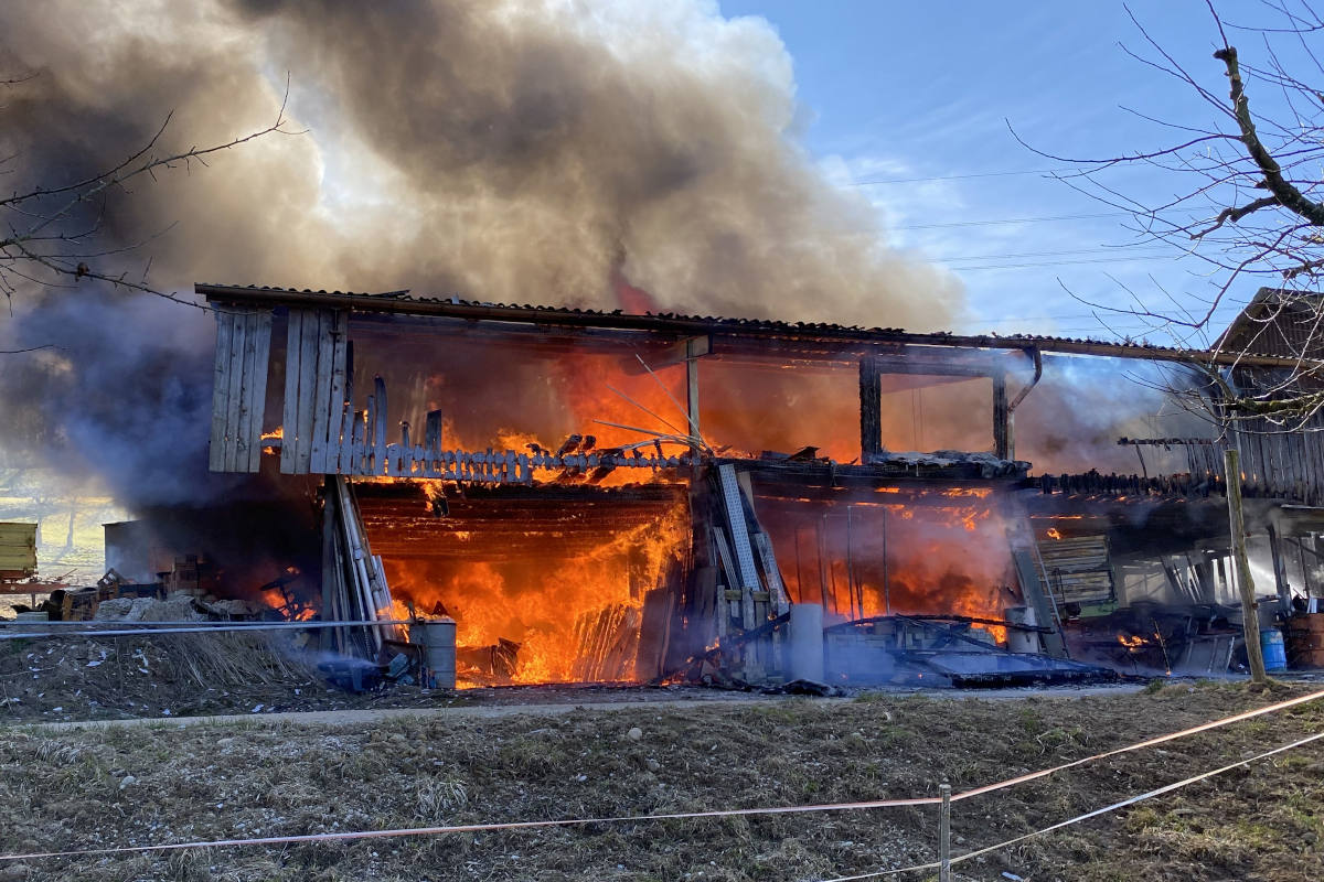 Die Scheune stand auf einem Landwirtschaftsbetrieb am Brachweg in Böbikon. Die Anwohner bemerkten den Brand am Montag, 14. März 2022, um 11:45 Uhr und alarmierten die Feuerwehr. Als diese mit einem Grossaufgebot eintraf, brannte das freistehende Holzgebäude lichterloh. Während die Löschkräfte die angrenzenden Gebäude schützen konnten, wurde die Scheune ein Raub der Flammen.