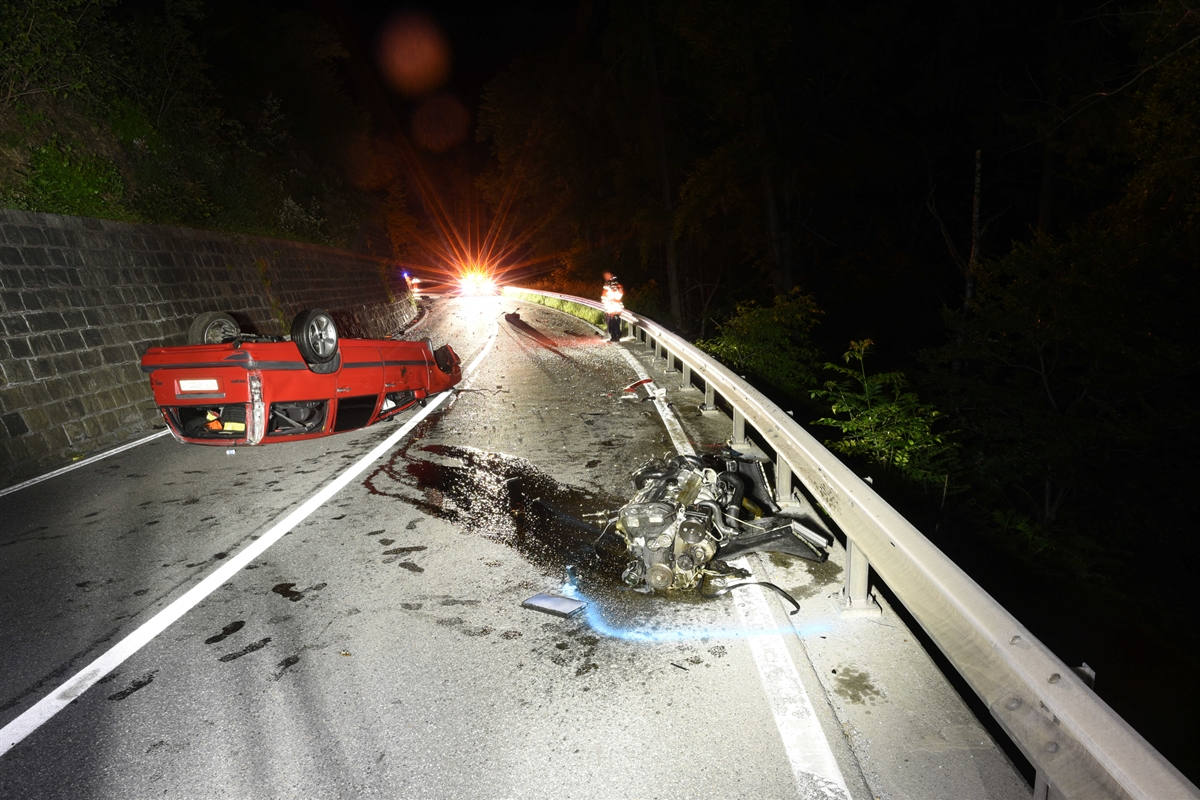 Ein 21-jähriger Fahrzeuglenker fuhr um 23:24 Uhr auf der Italienischen Strasse von Reichenau kommend in Richtung Bonaduz. Innerhalb einer Linkskurve, am sogenannten Bonaduzerstutz, verliess das Fahrzeug die Fahrbahn und kollidierte anschliessend heftig mit dem Beginn einer Stützmauer. Wegen der hohen Kollisionskräfte hob der Personenwagen ab und gelangte, sich überschlagend, wieder auf die Fahrbahn zurück. Weiter wurde der gesamte Motorblock aus der Karosserie herausgerissen. Der Personenwagen kam anschliessend in Dachlage, der kurzzeitig brennende Motorblock unmittelbar an der Leitplanke, zum Stillstand.