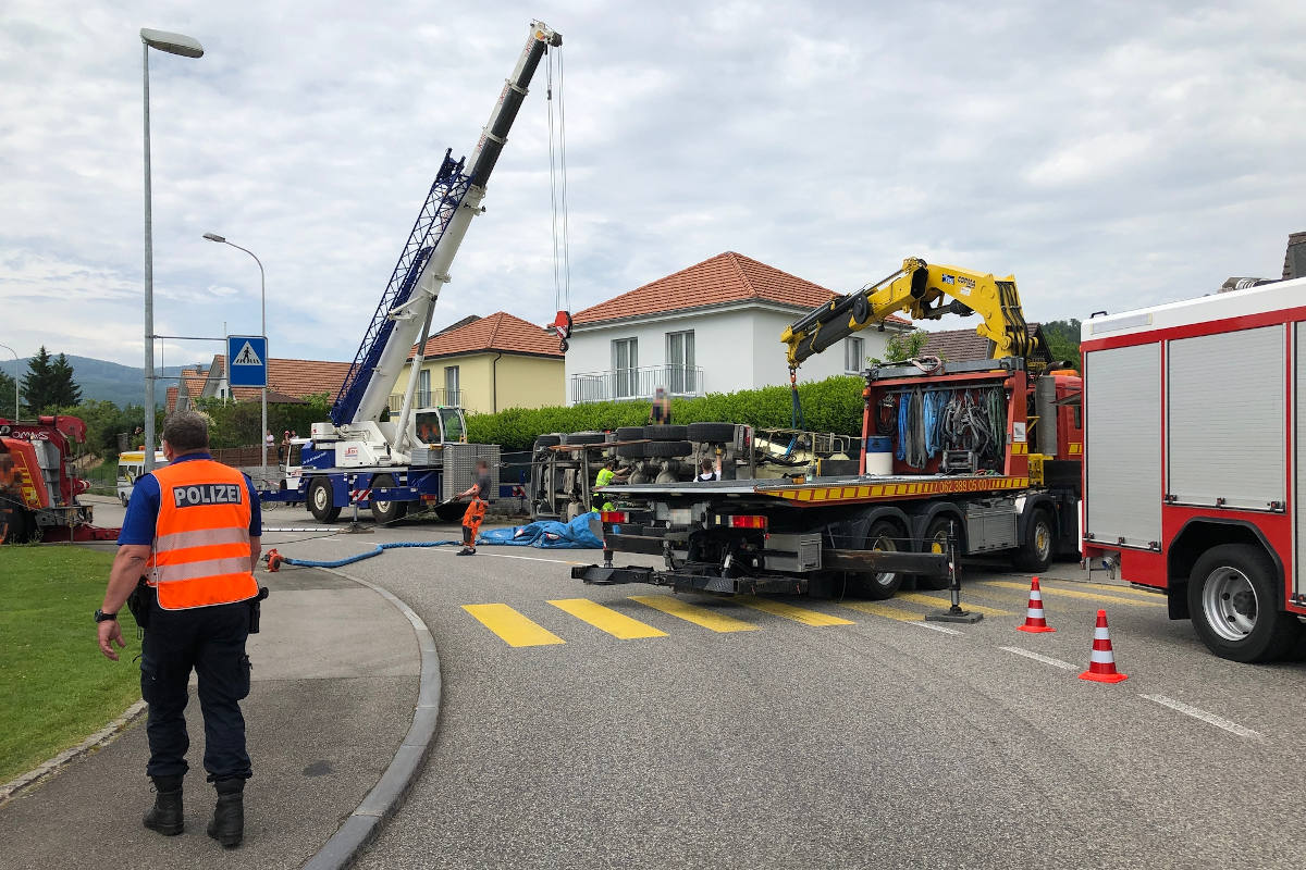 Um das Fahrzeug wieder auf die Räder zu stellen, wurden zwei Kranfahrzeuge aufgeboten. Die Strasse war während mehreren Stunden gesperrt. Wegen auslaufenden Flüssigkeiten und für die Verkehrsumleitung standen nebst der Polizei und den Abschleppdiensten auch Angehörige der Feuerwehr Boningen im Einsatz.