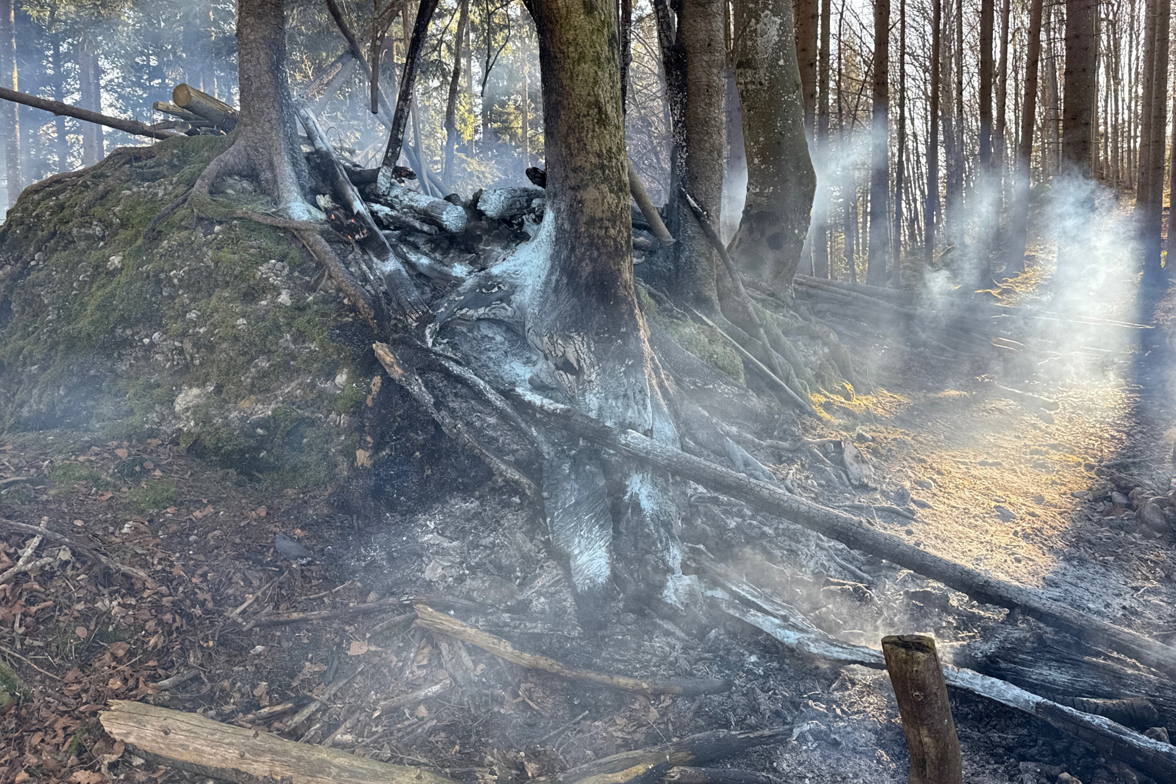 Dort wurde das Feuer in einer Brätelstelle nicht vollständig gelöscht und entfachte sich wegen Windböen einige Zeit später wieder. Das Feuer griff auf angrenzende Bäume und einen Unterstand über.