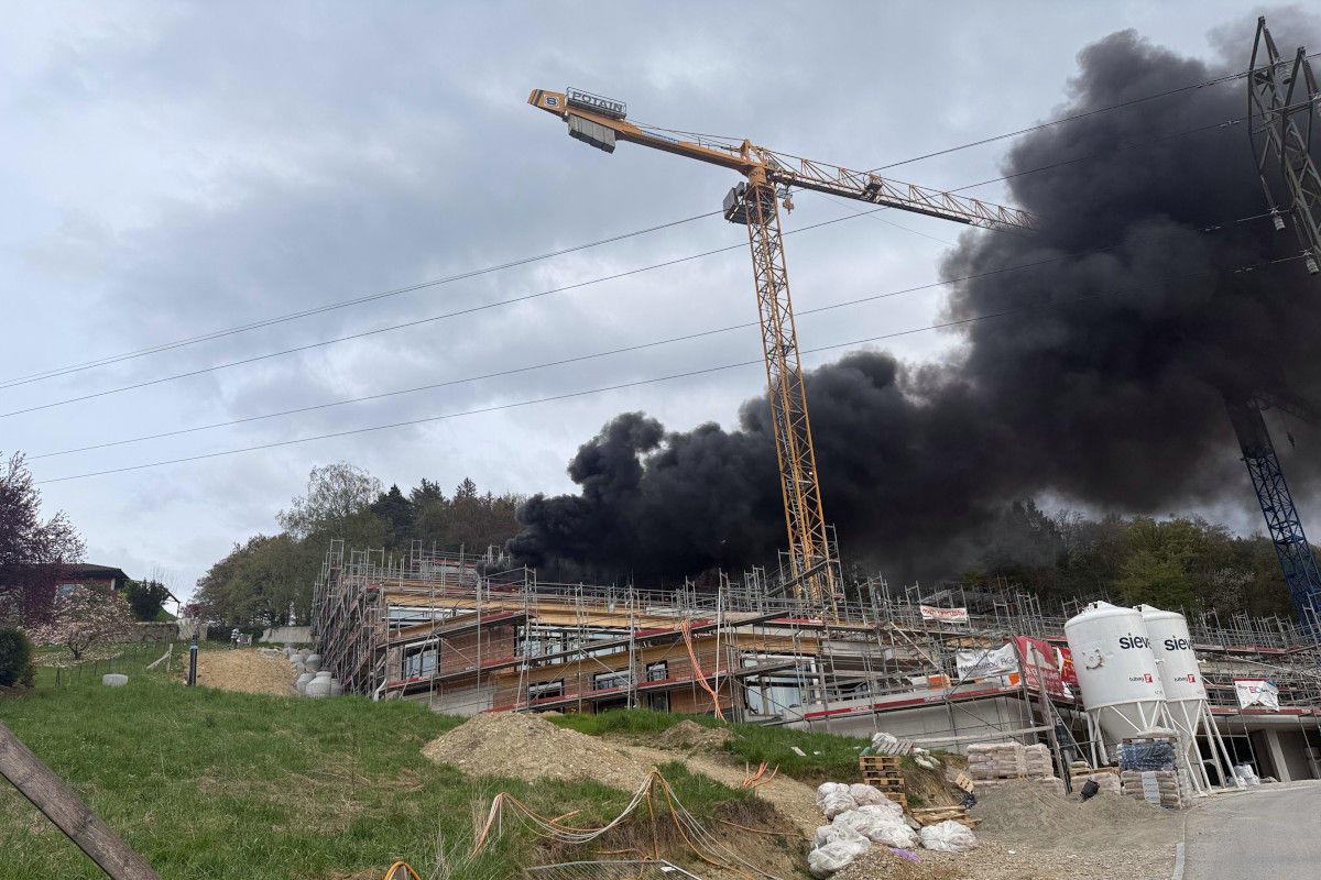Schauplatz war eine im Bau befindliche Terrassensiedlung am Gartenweg in Erlinsbach. Augenzeugen sahen am Freitag, 10. April 2026, kurz nach 17.30 Uhr, dass ein Brand ausgebrochen war. Während weitum sichtbar pechschwarzer Qualm aufstieg, sorgte eine explodierende Gasflasche für einen lauten Knall.