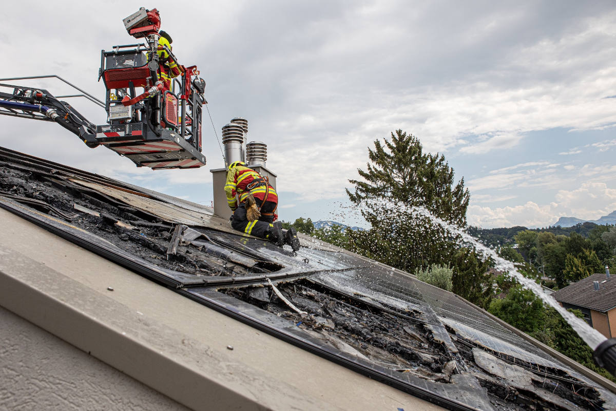 Die Herausforderungen für die Einsatzkräfte waren neben den hohen Aussentemperaturen die Solarpanels. Solarpanels produzieren bei Sonneneinstrahlung immer Strom und können nicht abgeschaltet werden. Es besteht deshalb die Gefahr eines Stromschlages für die Einsatzkräfte. Deshalb wurden die Interventionen bei der Photovoltaikanlage mit grosser Vorsicht, unter Einhaltung von Sicherheitsabständen sowie Verwendung von Hochvolt-Schutzhandschuhen und Absturzsicherung ausgeführt.