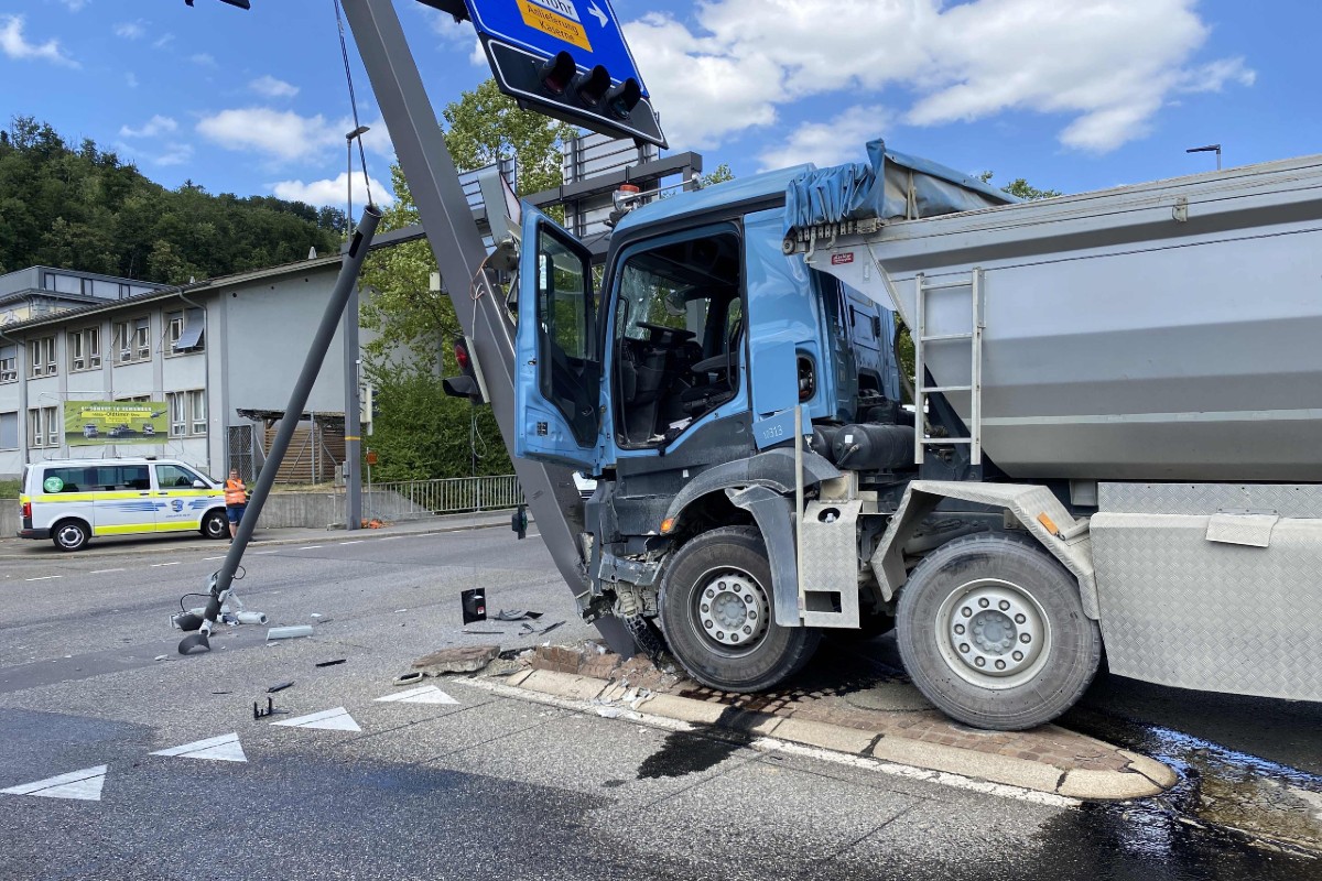 Brugg. Der Muldenkipper rollte vom Zentrum kommend über die Aarebrücke auf die Kreuzung zu, wo dessen Fahrer nach rechts abbiegen wollte. Jedoch verlor der 70-Jährige die Kontrolle über den Lastwagen, worauf dieser frontal gegen den massiven Mast der Lichtsignalanlage prallte.