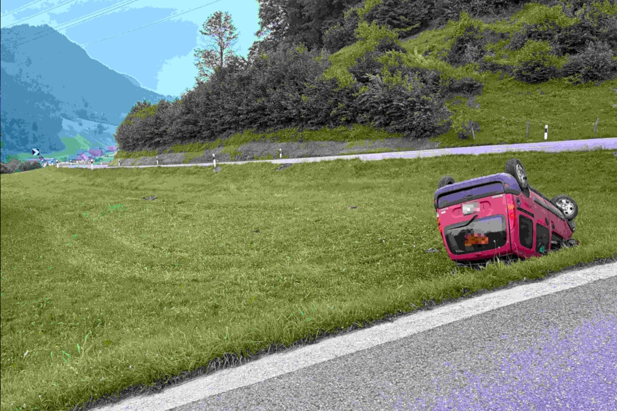 Als die aufgebotene Polizeipatrouille vor Ort eintraf, stellte sie das Auto auf dem Dach liegend in einem Wiesland abseits der Strasse fest. Personen waren keine mehr vor Ort.