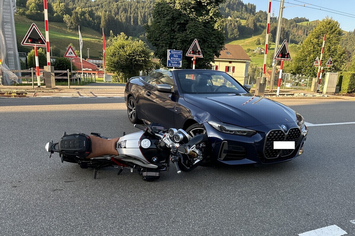 Ein 55-jähriger Lenker fuhr kurz nach 07.15 Uhr vom Herrenmoos kommend mit seinem Personenwagen über den Bahnübergang in Richtung Dorfstrasse. Dort wollte er nach links in Richtung Teufen einbiegen und fuhr zu diesem Zweck langsam zwischen den in Fahrtrichtung Gais stehenden Fahrzeugen durch. Beim weiteren Einbiegen übersah er ein aus Richtung Gais herannahendes Motorrad und kollidierte in der Folge mit diesem.