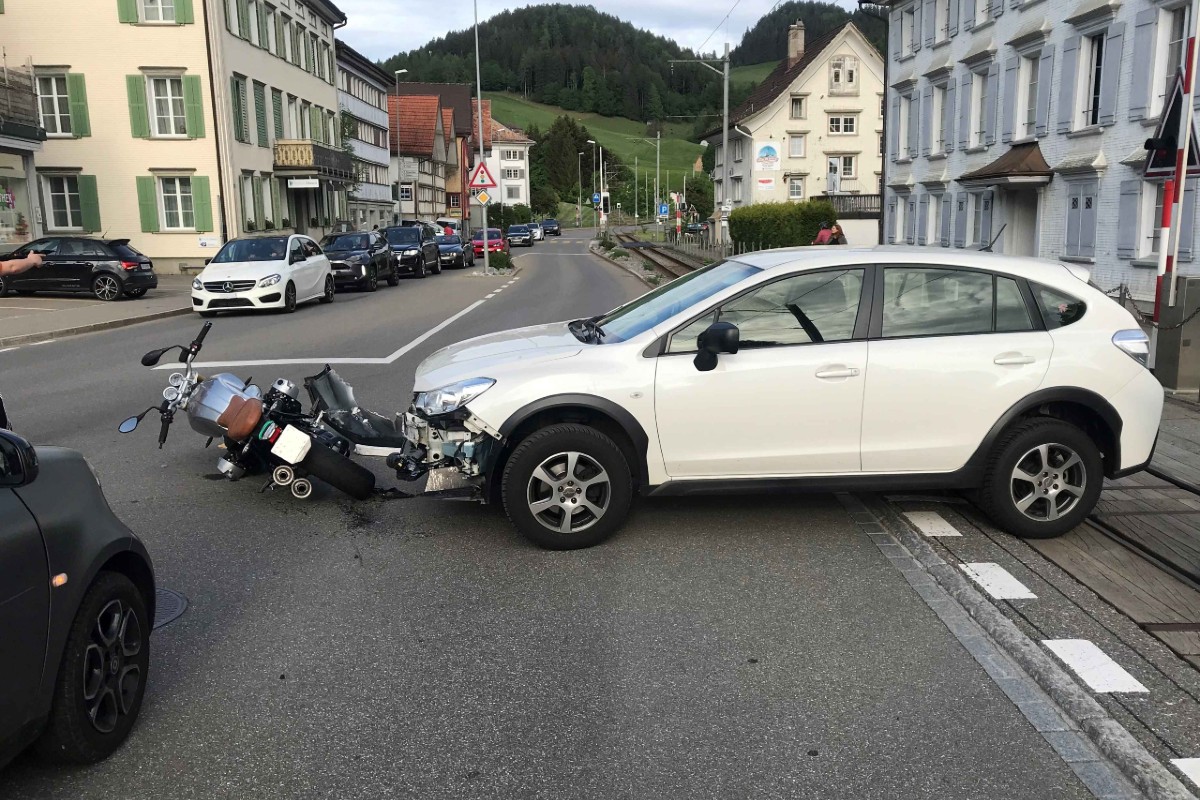 Um 18.20 Uhr fuhr gestern ein 60-jähriger Motorradfahrer mit seinem Töff auf der Dorfstrasse von Teufen kommend in Richtung Gais. Zur selben Zeit beabsichtige eine 51-Jährige aus der Nebenstrasse vom Dorf nach links in die Dorfstrasse einzufahren und es kam zur Kollision.