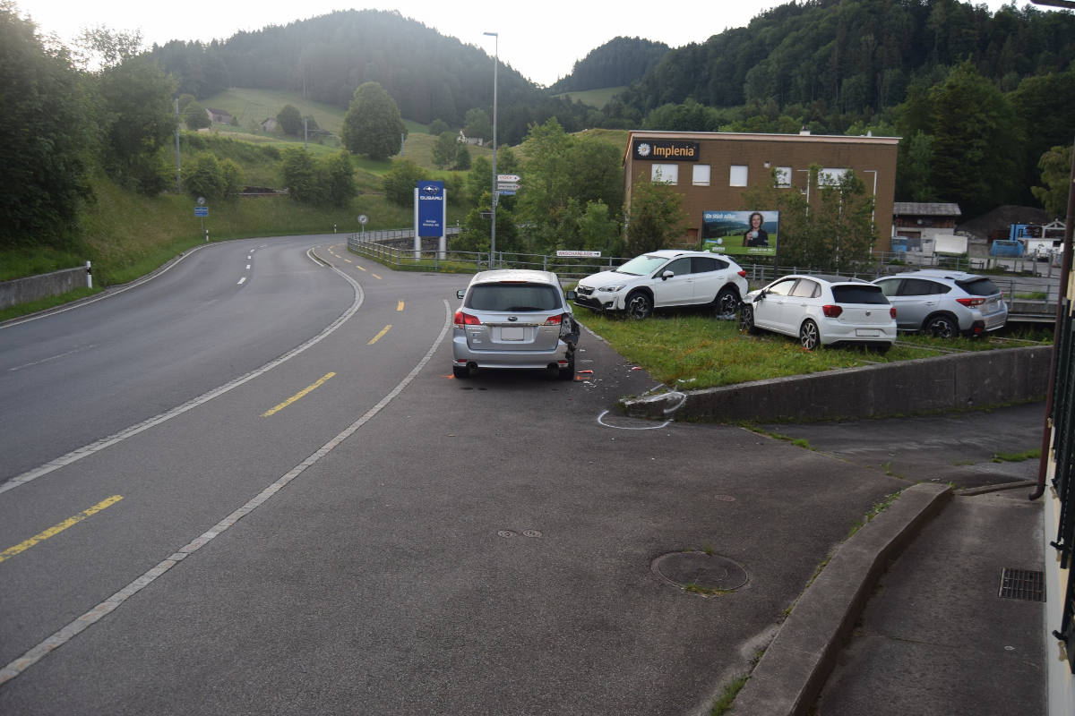 Um 01:30 Uhr fuhr ein 31-jähriger Mann zusammen mit seiner 29-jährigen Beifahrerin von Bühler in Richtung Gais. Ausgangs Bühler, kurz nach dem Bahnübergang, geriet er infolge eines Sekundenschlafes rechts über die Fahrbahn und kollidierte in der Folge mit drei parkierten Fahrzeugen auf einem Abstellplatz. Beide Autoinsassen blieben unverletzt.