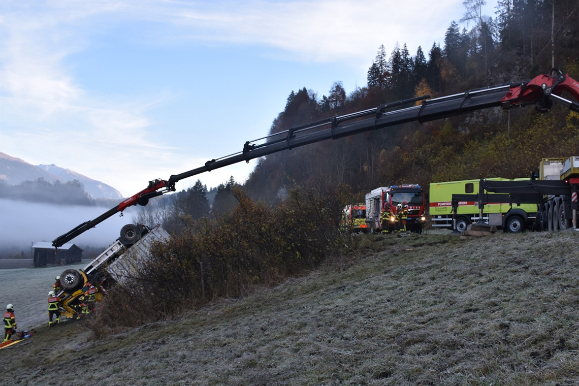 Der 67-jährige Chauffeur fuhr gegen 8 Uhr mit dem Lastwagen von Castrisch kommend über die Rechtsrheinische Oberländerstrasse in Richtung Valendas und überschlug sich eine Böschung hinunter. Dabei wurde der Mann eingeklemmt.