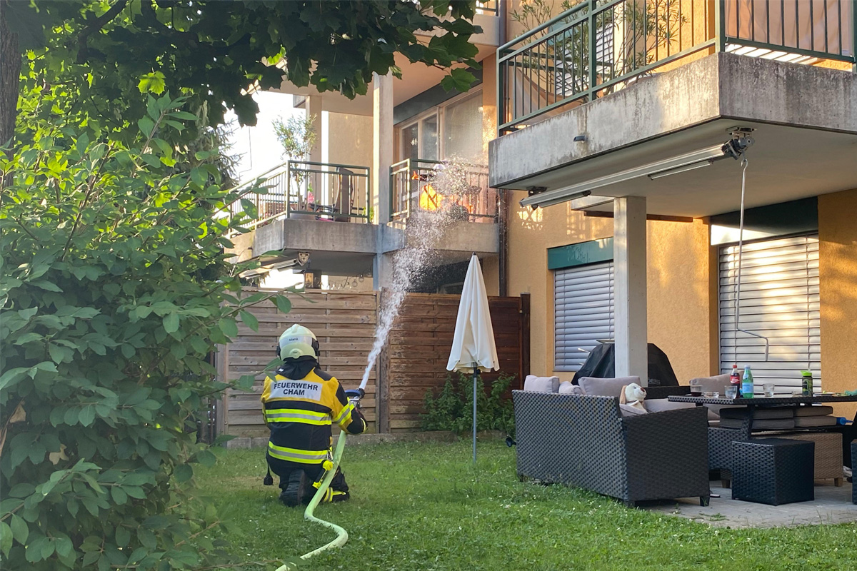 Am Mittwochabend, 25. Juni 2025, ist in Cham auf einem Balkon eines Mehrfamilienhauses ist ein Gasgrill in Brand geraten. Dabei wurde eine Person verletzt. Die Feuerwehr konnte ein Übergreifen auf das Gebäude verhindern.