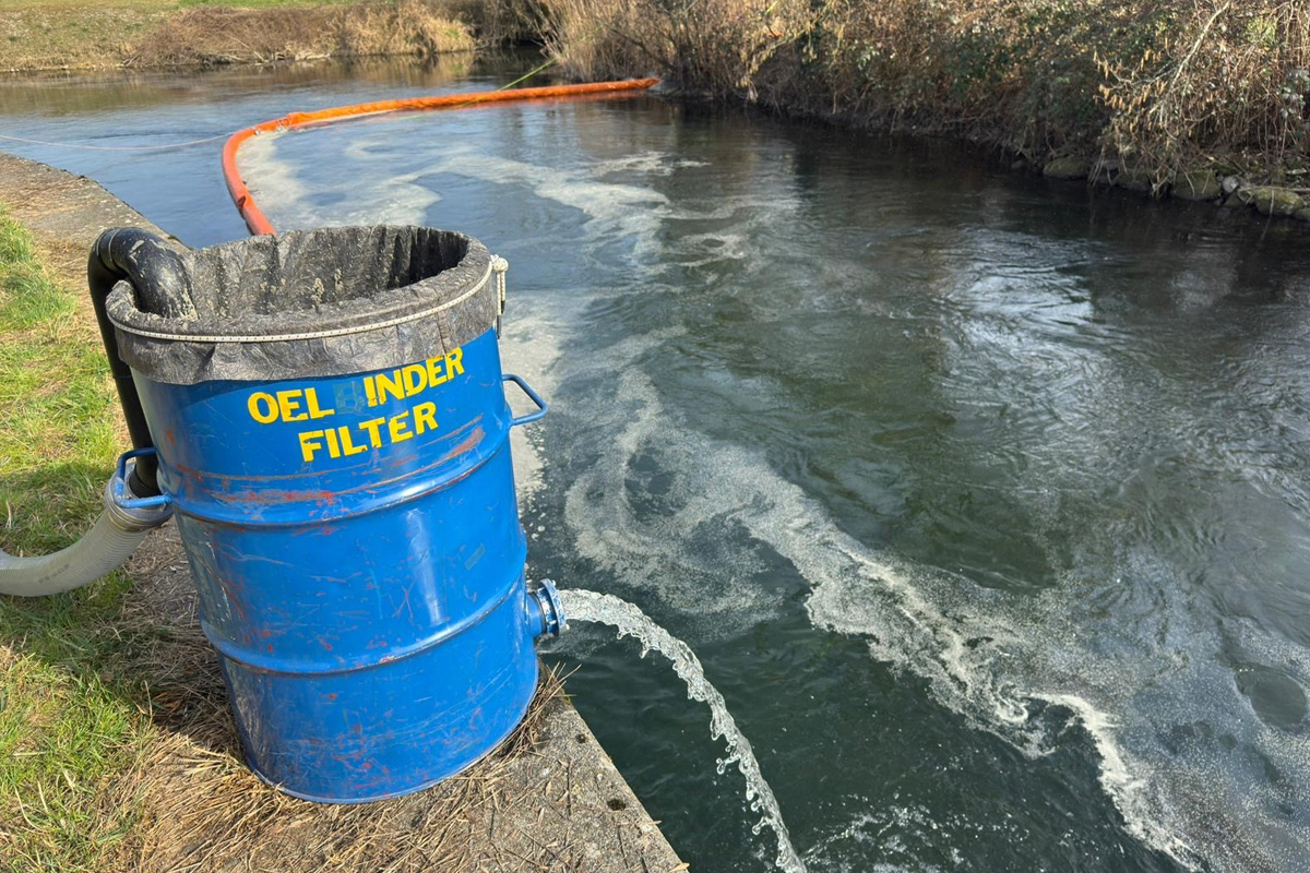 Gesammeltes Heizöl wird aus der Lorze abgesaugt. (Bildquelle: Zuger Polizei)