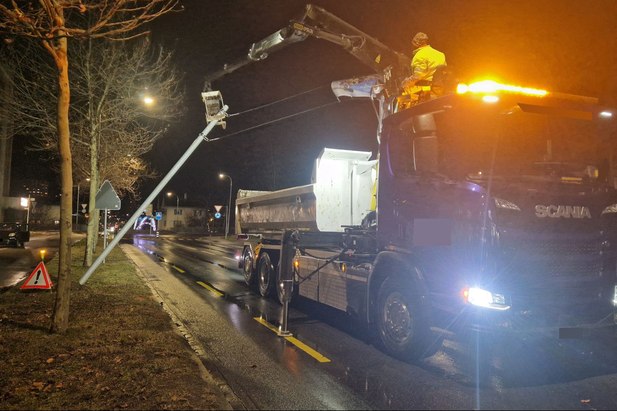 Auf der Ringstrasse musste ein Pfosten einer Strassenbannerwerbung mittels Lastwagenkran entfernt werden. (Bildquelle: Stadtpolizei Chur)