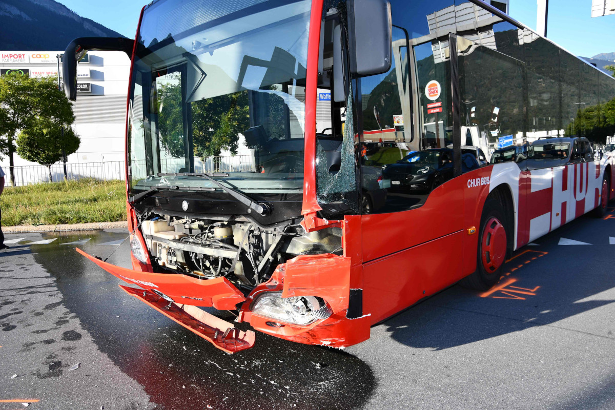 Beim Unfall wurde eine Buspassagierin sowie die Beifahrerin im Auto verletzt. (Bildquelle: Stadtpolizei Chur)