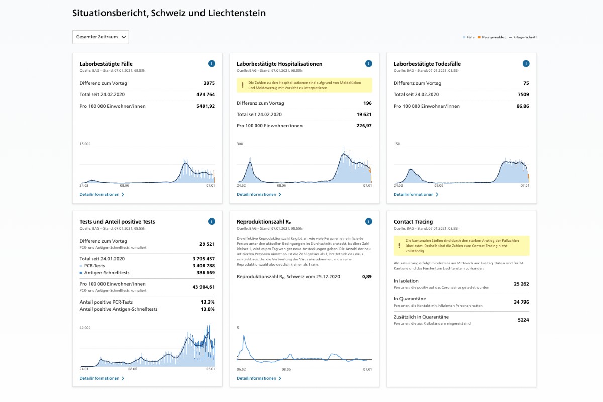 Die hier veröffentlichen Daten basieren auf Informationen, die uns Laboratorien, Ärztinnen und Ärzte sowie Spitäler übermittelt haben. Sie beziehen sich auf Meldungen, die wir heute früh erhalten haben und können deshalb von denjenigen Zahlen abweichen, welche die Kantone kommunizieren.