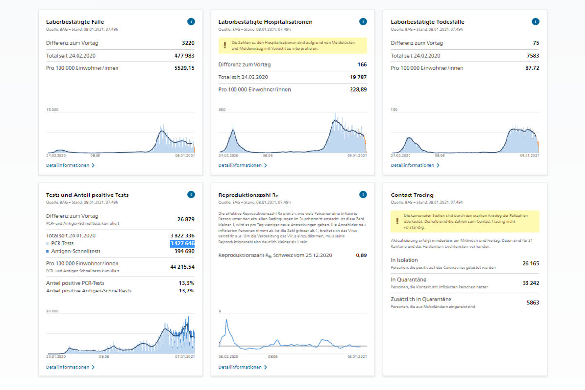 Die hier veröffentlichen Daten basieren auf Informationen, die uns Laboratorien, Ärztinnen und Ärzte sowie Spitäler übermittelt haben. Sie beziehen sich auf Meldungen, die wir heute früh erhalten haben und können deshalb von denjenigen Zahlen abweichen, welche die Kantone kommunizieren.